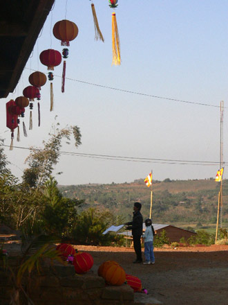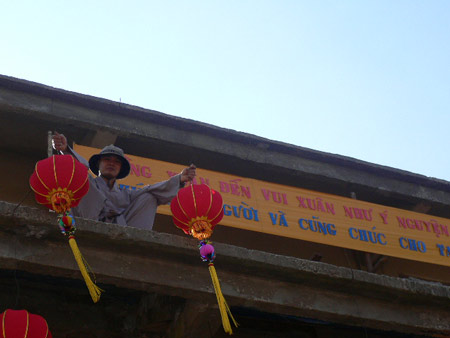 Tuy vậy, không khí đón xuân ở chùa vẫn tưng bừng cờ xí và lòng đèn cũng như những câu chúc xuân tràn đầy đạo vị. Ngay từ chân đồi là cổng tre treo câu đối xuân rất đặc trưng của miền quê, và những lá cờ Phật giáo tung bay được trang trí từ chân đồi lên tới chùa.