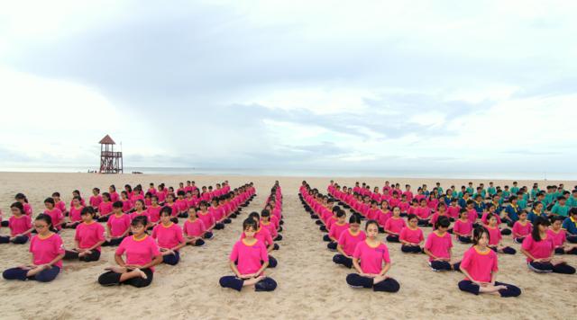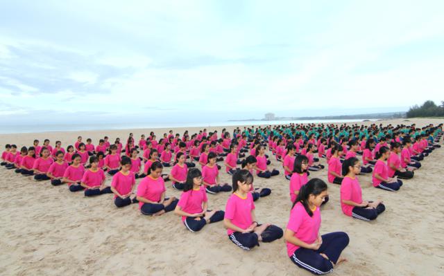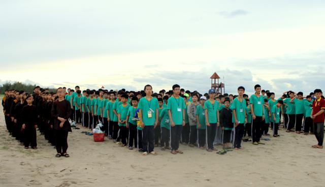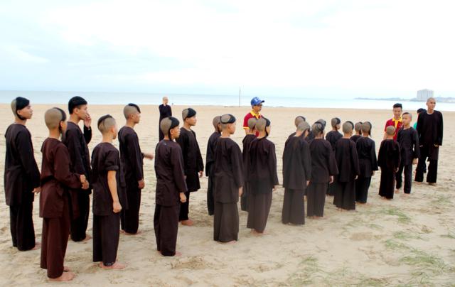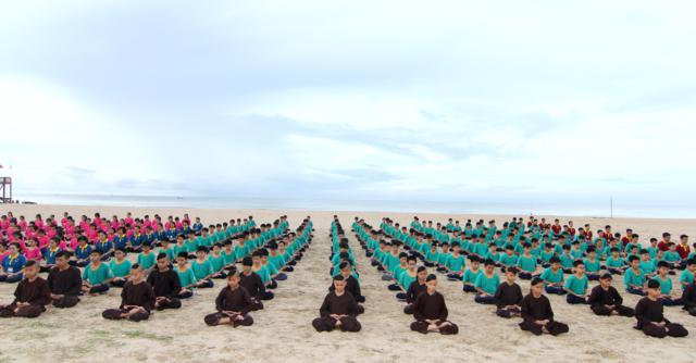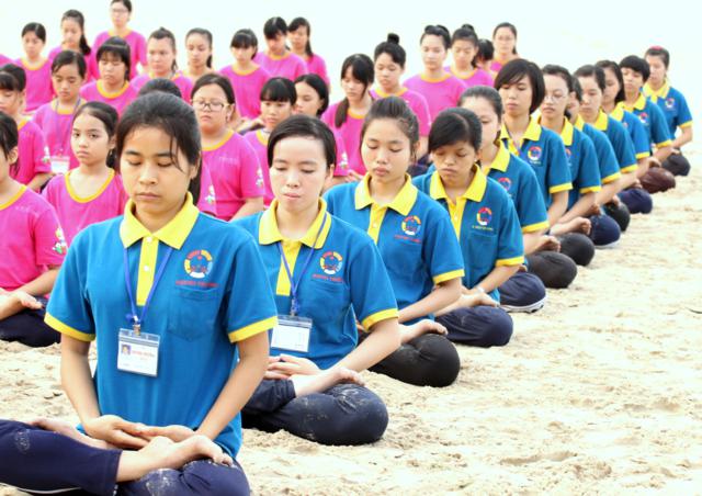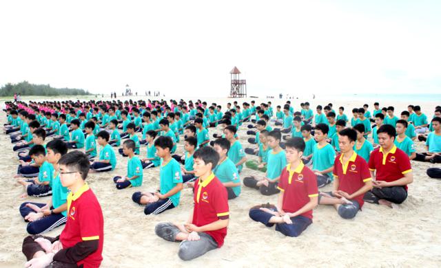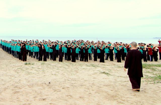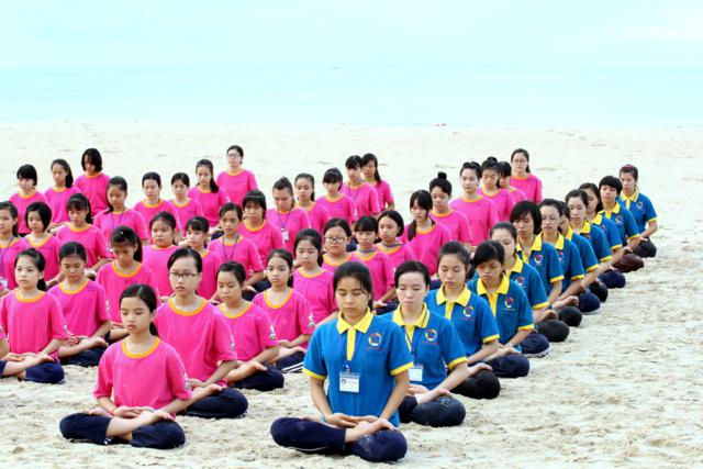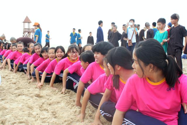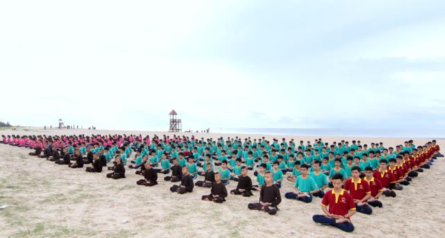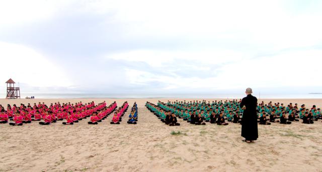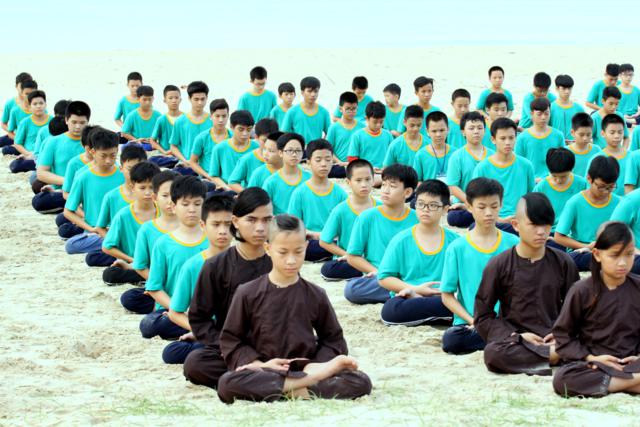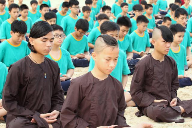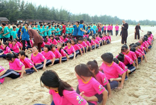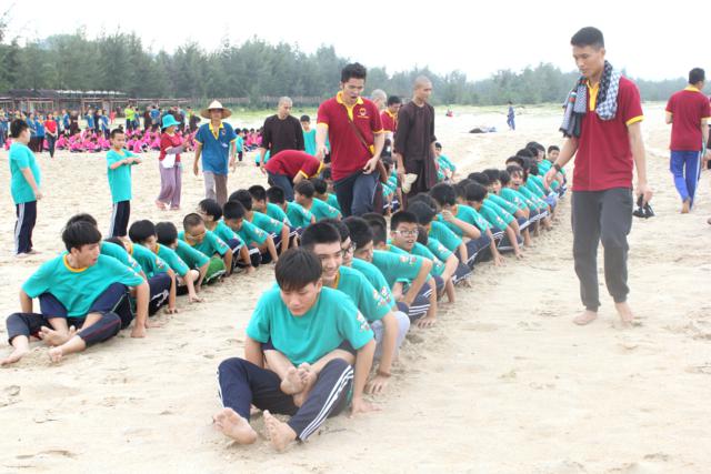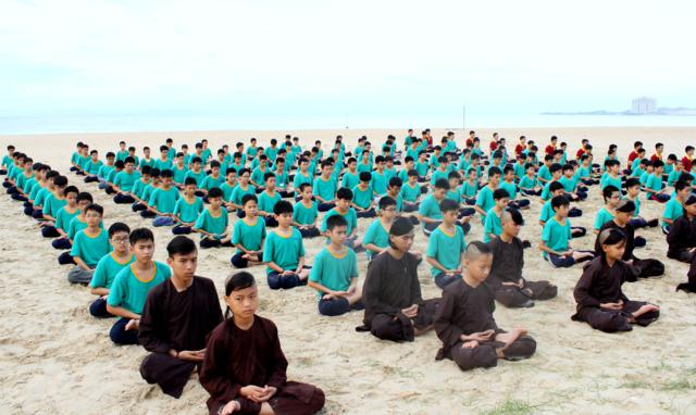 Liền đó, theo tiếng còi, nhiều bước chân trần chạy thoăn thoắt ra bãi biển. Các em như búp non đầu cây, về với thiên nhiên trong lành ai cũng nói cười như sóng đùa biển khơi, nhưng chưa được vui chơi ngay. Đầu tiên, theo hiệu lệnh các em ngồi Thiền trên biển 30 phút. Một đội hình thanh thiếu niên ngồi thiền nghiêm trang giữa đất trời mênh mông lộng gió, trải dài trên bãi cát. Hình ảnh ấy không gì đẹp hơn và cũng đem đến cho chúng ta sự suy nghiệm về tính bình đẳng thiết thực của thiền trong đời sống, rằng: “Phật giáo không chỉ dành riêng cho những người già” mà rất thích hợp với tuổi trẻ là tuổi hăng say hoạt động.