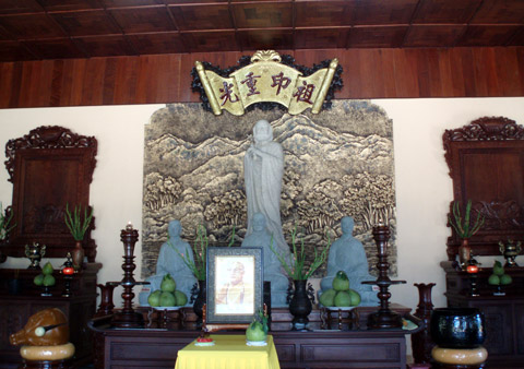 Tượng Bồ Đề Đạt Ma và Tam Tổ Thiền phái Trúc Lâm, di ảnh Cố Hòa thượng Thích Thiện Hoa