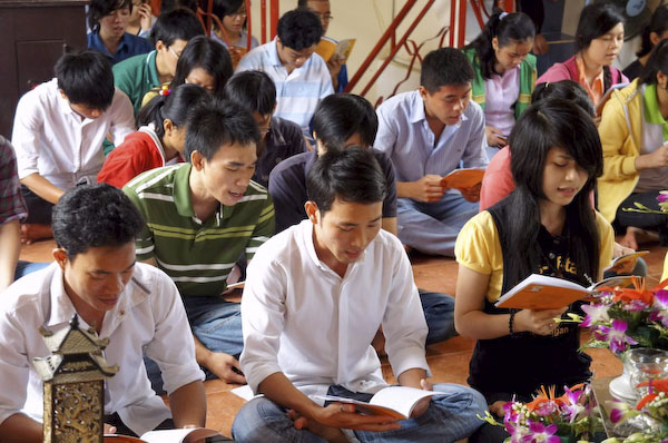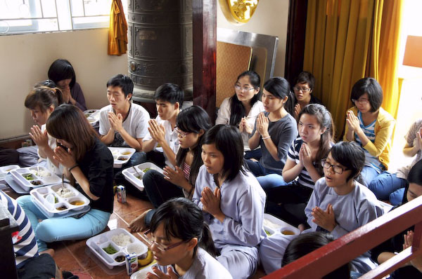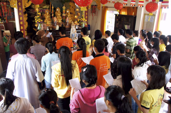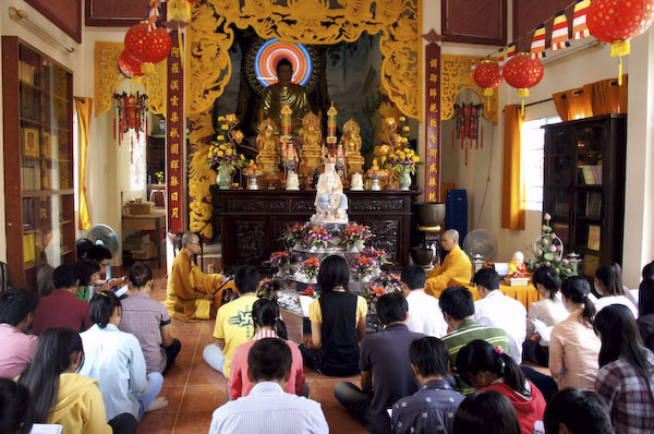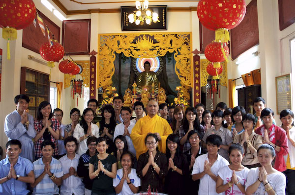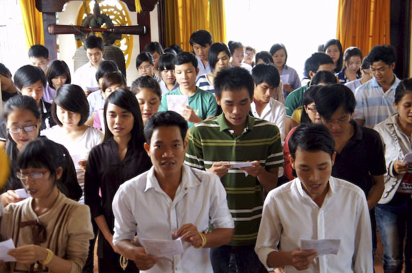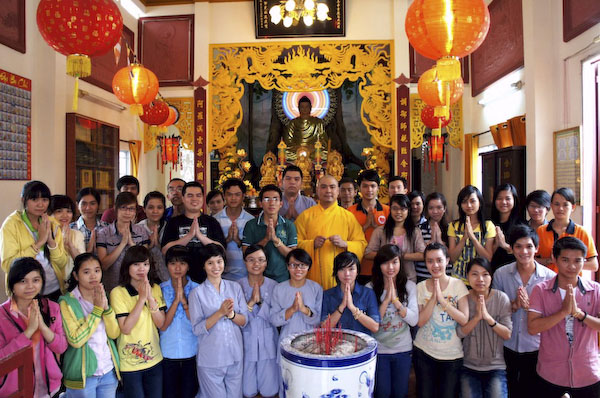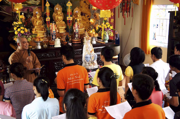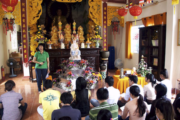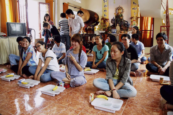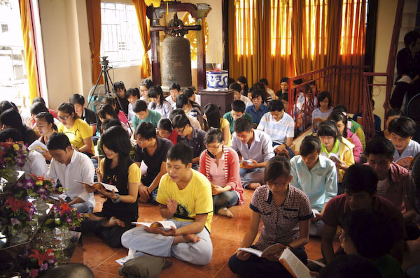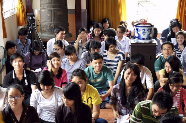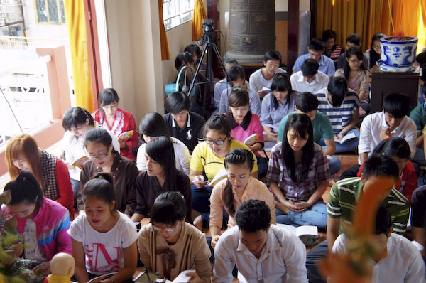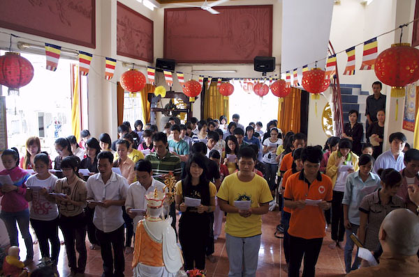 Với số lượng 100 bạn trẻ đã ngồi chật kín khu vực chánh điện của bản tự để tham dự khóa lễ tụng kinh Pháp Hoa – Phẩm Phổ Môn – Sức mạnh Quán Thế Âm. Ý nghĩa của pháp bảo huyền văn đã lan tỏa vào tâm thức các bạn trẻ để có thể ứng dụng sự thực tập hạnh lành của Bồ Tát “Mắt thương nhìn cuộc đời”.