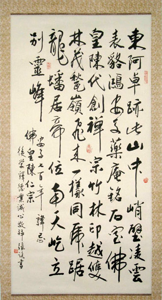 Cảm nhận thấy bài thơ cô đọng, thật thâm sâu ca ngợi công đức Nhà Vua- Phật Hoàng Trần Nhân Tông, Phật tử Nguyễn Hữu Tuyến đã bạch với Hòa Thượng Thích Đức Nghiệp xin thành tâm nhờ họa sĩ Trương Lộ – Phó Chủ tịch Hội Thư pháp Hán TP Hồ Chí Minh viết thư pháp Hán bài thơ này để phụng cúng lên Trúc Lâm Thiền Viện Yên Tử.