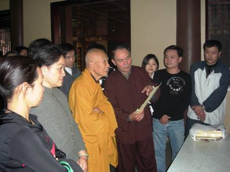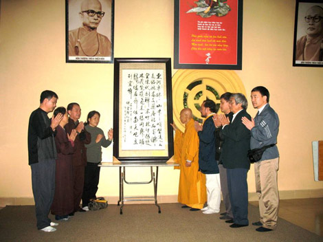 Tại Trúc Lâm Thiền Viện Yên Tử, sáng mồng 7 Tết Kỷ Sửu 2009, Phật tử Nguyễn Hữu Tiến diện kiến trình bầy với Hòa Thượng Thích Kiến Viên về tâm nguyện phụng cúng bức thư pháp Ca ngợi Phật Hoàng Trần Nhân Tông cùng với 500 bản tạm dịch và lễ hoa quả dâng cúng Phật Tổ.