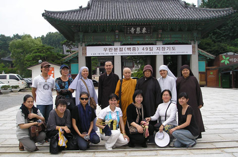 Xúc động nhất là khi phái đoàn đến chiêm bái chùa Yong Yu Sa (Cối Nham Tự) tọa lạc trong cảnh núi rừng trùng điệp, tiếng suối róc rách, chim hót líu lo, không gian tĩnh lặng gần sát biên giới Nam-Bắc Triều Tiên. Là chứng nhân lịch sử từng ‘thực mục sở thị’ và thấu hiểu nỗi thống khổ khi đất mẹ Việt Nam bị chia cắt thành đôi miền nam bắc bởi ngoại bang, ni trưởng Huệ Giác đã cử đại đức Minh Trí gióng Đại Hồng Chung và chỉ đạo tất cả thành viên trong đoàn tĩnh tọa tụng kinh, niệm Phật trong ngôi già lam này để nhất tâm cầu nguyện cho chiến tranh hận thù mau chấm dứt, hòa bình thống nhất sớm trở về trên bán đảo Triều Tiên.
