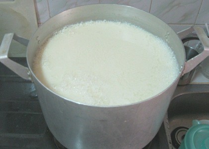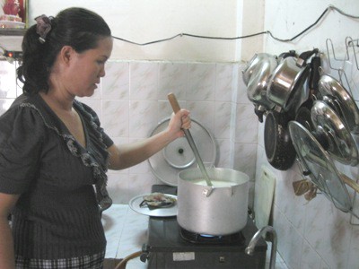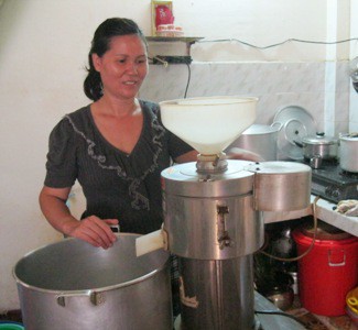 Một cái máy xay đậu bằng inox, vài cái nồi nấu đậu bằng nhôm trắng phau, bếp núc gọn gàng sạch sẽ. Chị bắc nồi nấu đậu và làm từng phần công việc ho đến khi ra sản phẩm đậu cho khách xem tận mắt. Chị nói: “Ông xã tôi vẫn ăn đậu nóng chấm với tương ăn hàng ngày. Các cháu đi học về cũng chỉ thích ăn đậu”. Như vậy, gia đình chị vừa có thức ăn thường xuyên vừa có lợi nhuận cho gia đình.
