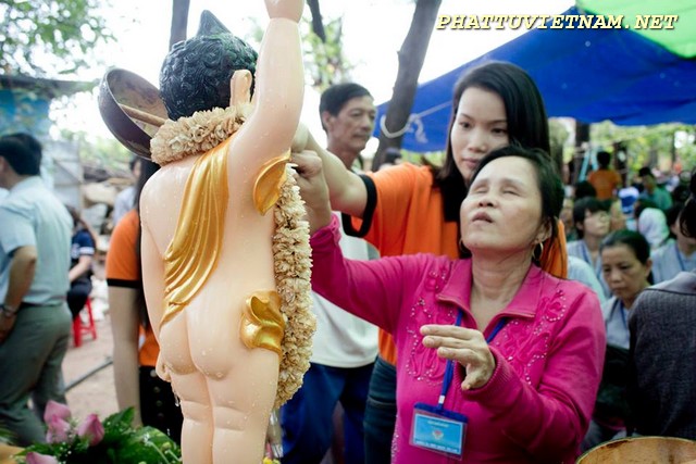 Nghe sư cô Hương Nhũ giải thích khi được múc ba gàu nước tắm Phật nhằm sám hối và thanh tịnh tam nghiệp thân, khẩu, ý của chính chúng ta, những người khiếm thị đã thì thầm niệm bài sám hối khi được thực hiện nghi thức “mộc dục” cao qúy này.