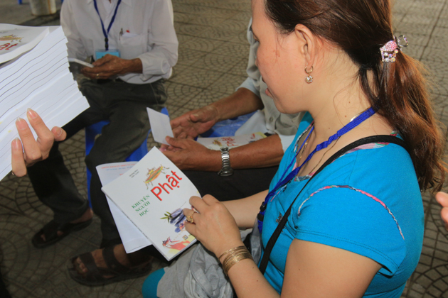 Ngoài việc khám bệnh – phát thuốc, ĐĐ. Thích Thông Đạo còn tặng sách “Khuyên người học Phật” cho bà con đến khám bệnh.