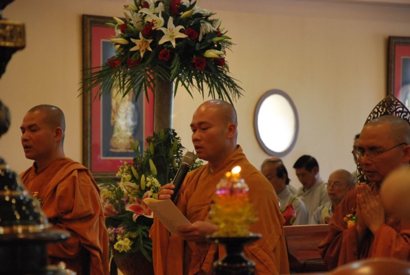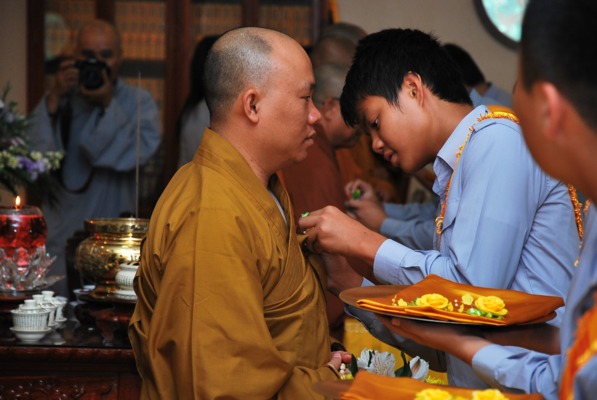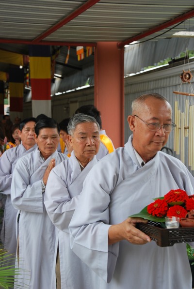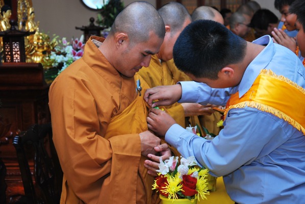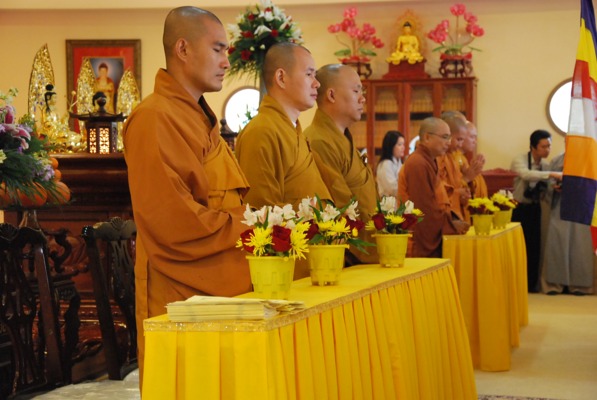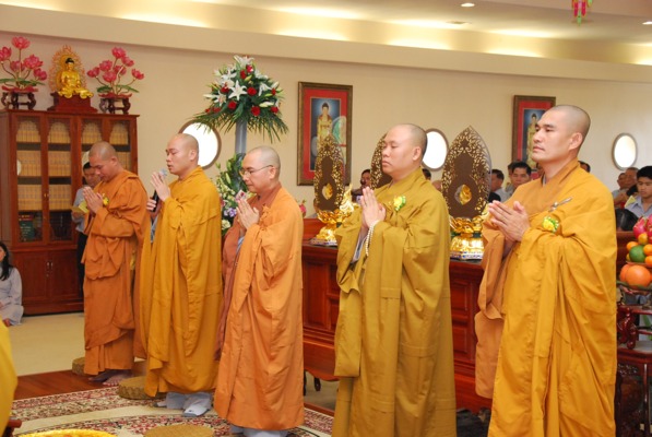 Tiếp đó, chư tôn đức cử hành nghi thức dâng hương cầu nguyện và cuối cùng là lễ cúng dường trai tăng, dâng pháp y. Buổi lễ kết thúc trong không khí đầm ấm tình yêu thương, tri ân và báo hiếu của người con Phật qua nhịp điệu Vu Lan về.