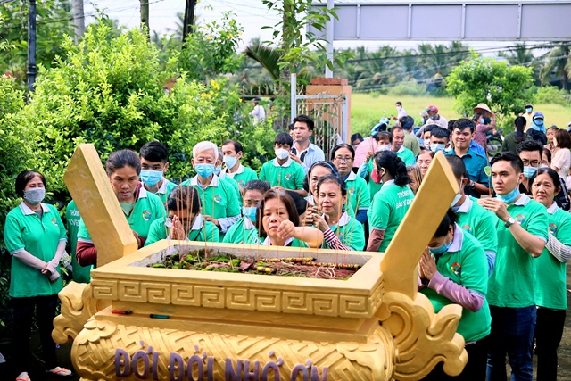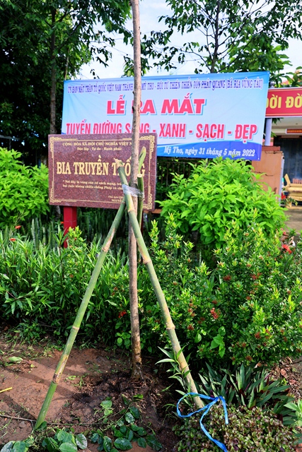 Đúng 7h30: Đại diện chính quyền, các Đoàn thể (hơn 20 người) và hơn 60 Phật tử Đạo tràng Phật Hóa cùng thắp hương tại Đài tưởng niệm xã và làm Lễ ra quân trồng cây