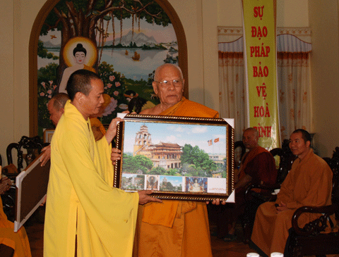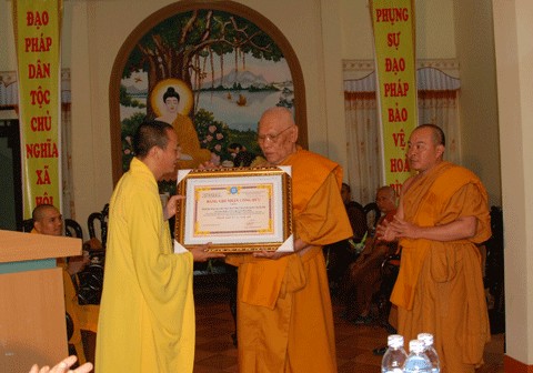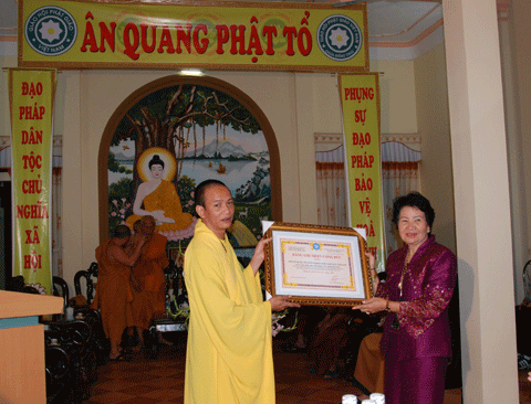 Thượng tọa Thích Quảng Hà trao tặng bằng tuyên dương công đức tới HT Phạ Mu Ni A No Ma Khua