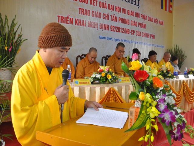 Tại hội nghị TT Thích Quảng Hà – Ủy viên TT HĐTS GHPGVN – Phó Ban TT Ban Kiểm soát TƯ GHPGVN- Phó Ban TT BTS Phật giáo tỉnh Nam Định báo cáo kết quả Đại hội Phật giáo toàn quốc nhiệm kỳ VII (2012-2017) cũng như những thành công mà Đại hội VII GHPGVN đạt được
