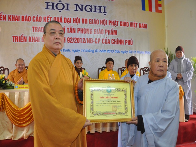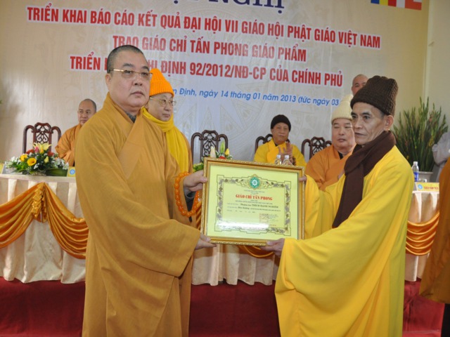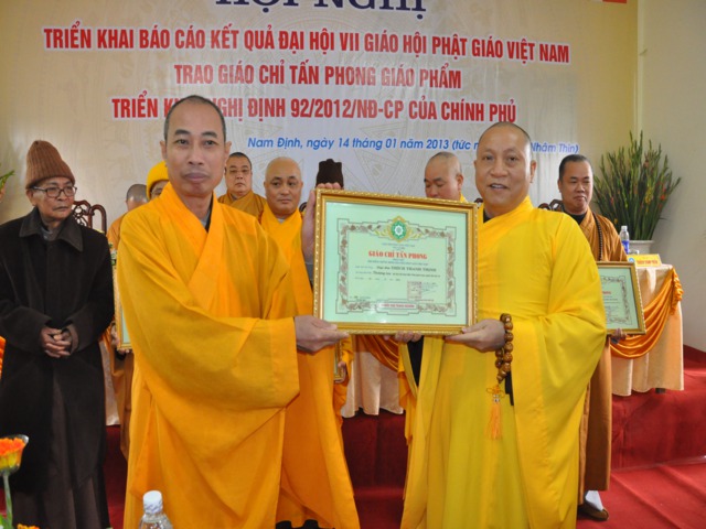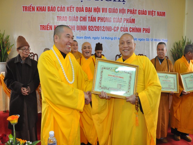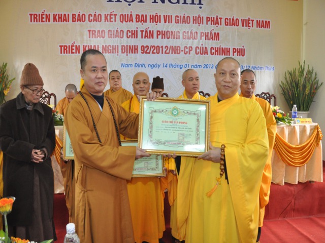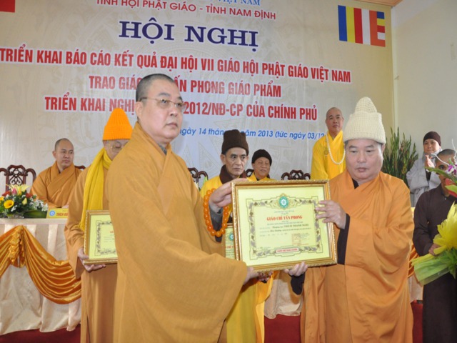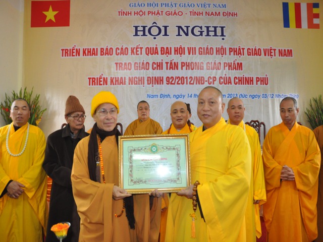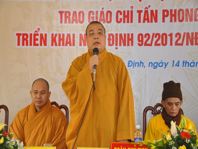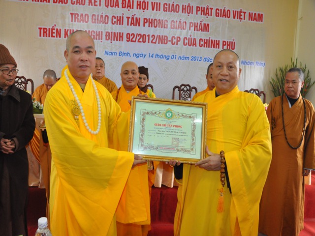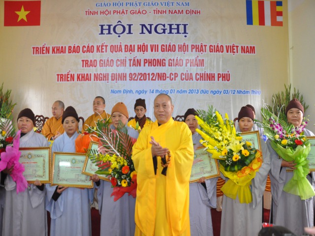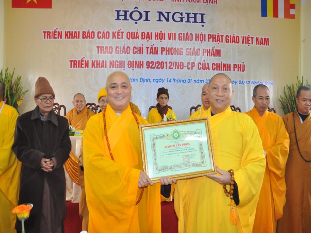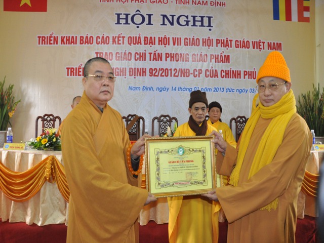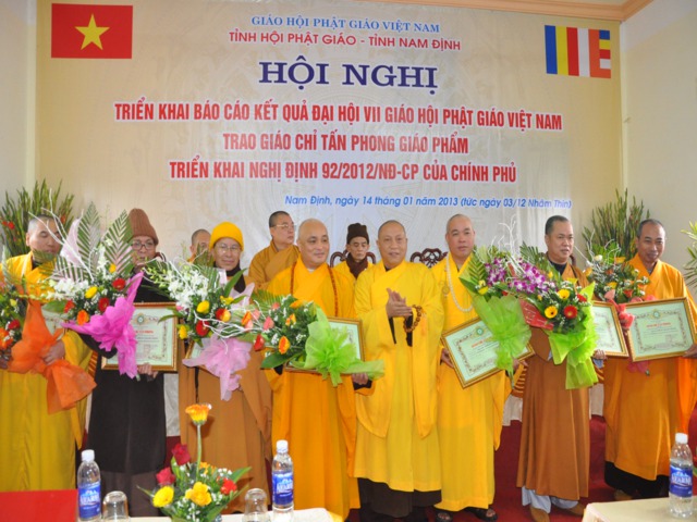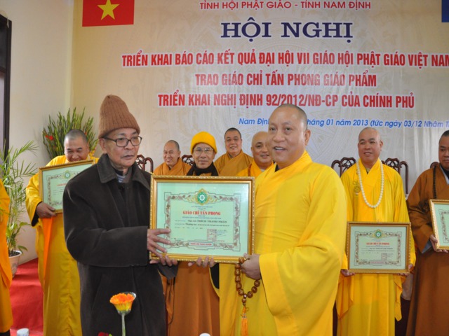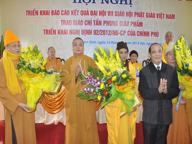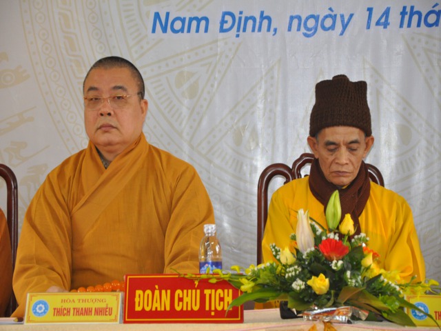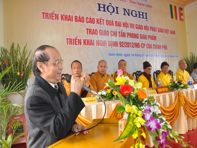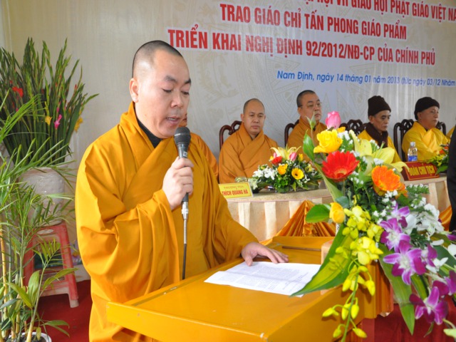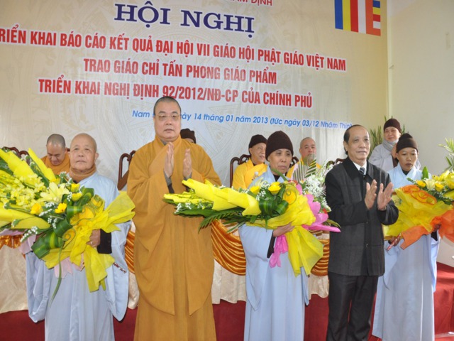 HT. Thích Thanh Nhiễu thay mặt HĐTS GHPGVN ban đạo từ , Hòa thượng chúc mừng Chư Tôn đức trực thuộc BTS GHPG tỉnh Nam Định được đón nhận giáo chỉ tấn phong giáo phẩm của Đức Pháp chủ HĐCM GHPGVN trong nhiệm kỳ VII (2012-2017). Hòa thượng cũng đã sách tấn chư tôn đức Ban Trị sự, tỉnh Nam Định cần phát huy hơn nữa tinh thần đoàn kết, hòa hợp, thực hiện triển khai nghị quyết nhiệm kỳ VII của GHPGVN đã đề ra theo đúng phương châm “Đạo pháp – Dân tộc – CNXH”.