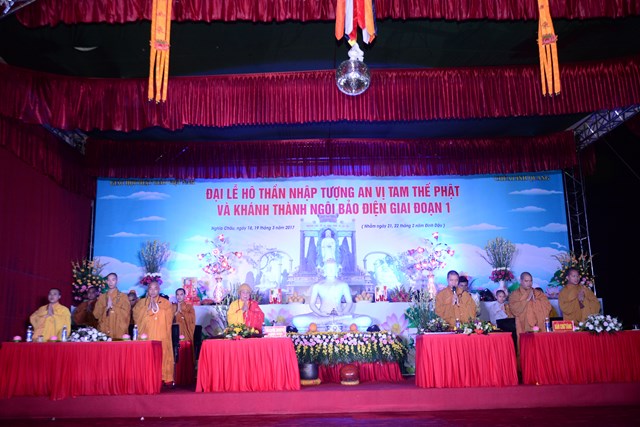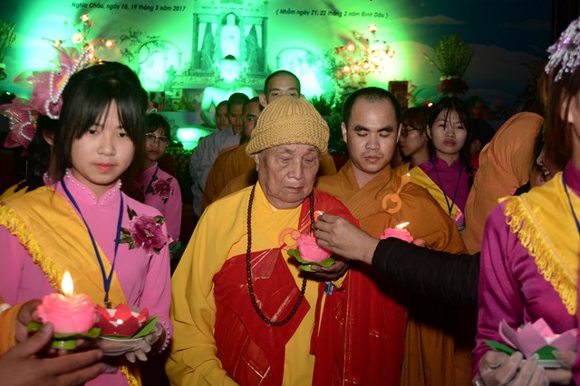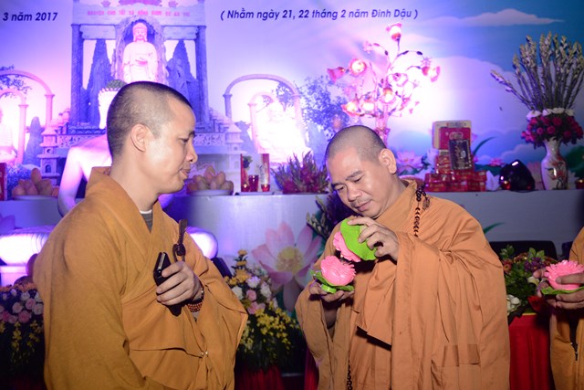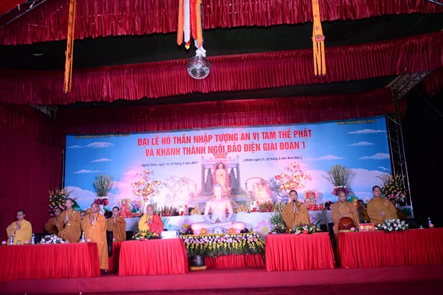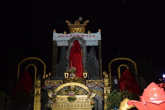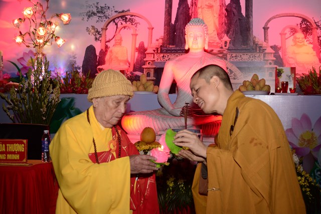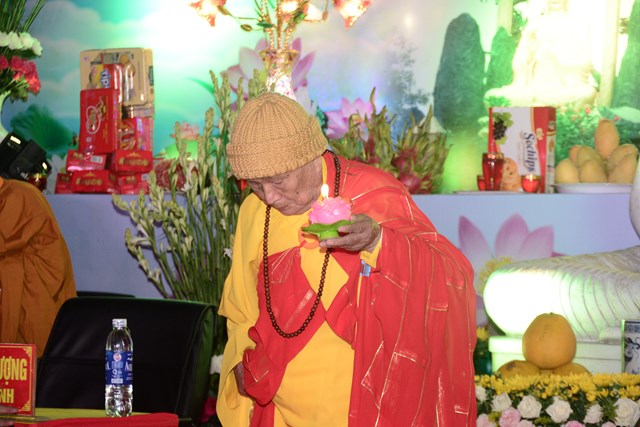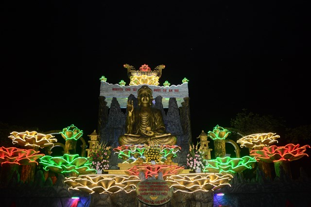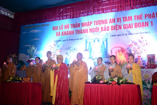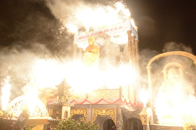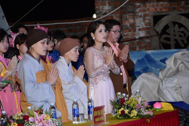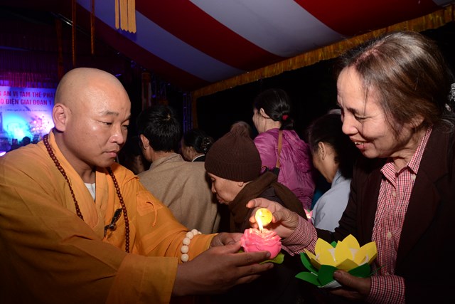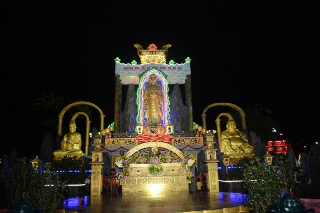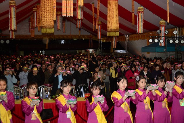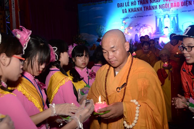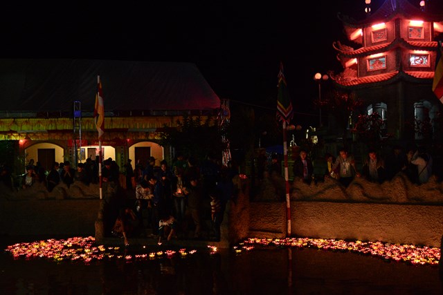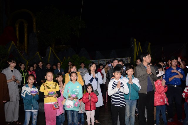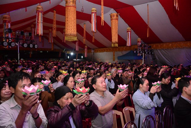 Thời khắc linh thiêng nhất của buổi lễ đã đến khi chư tôn đức chính thức cử hành nghi lễ trì chú an vị tôn tượng Tam thế Phật lộ thiên và hoa đăng cầu nguyện cho thế giới hòa bình, chúng sinh an lạc. Những ngọn nến lung linh huyền ảo đã được dần dần thắp sáng khắp sân chùa làm xóa tan màn vô minh si ám với niềm hy vọng ánh sáng của mười phương chư Phật, ánh sáng của từ bi và trí tuệ sẽ lan tỏa khắp muôn nơi mang đến niềm an vui cho mọi người nhân dịp xuân mới.