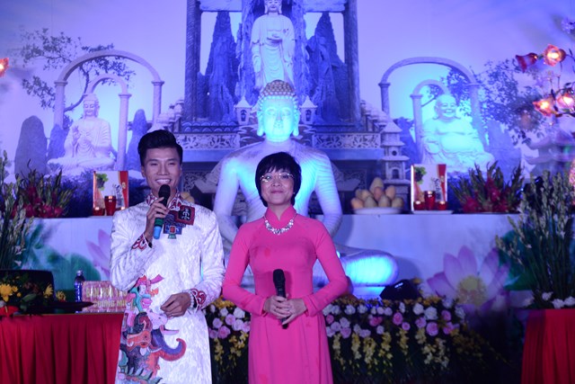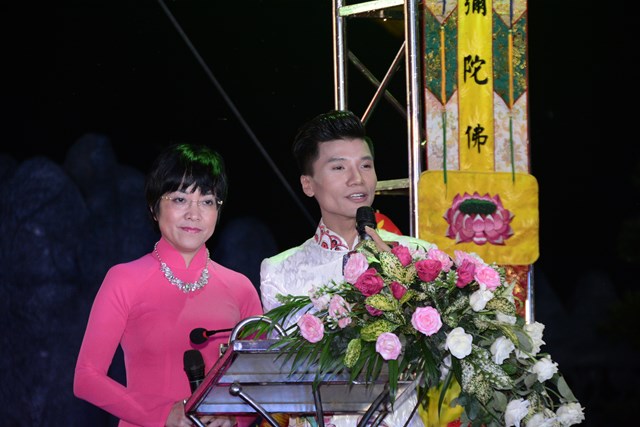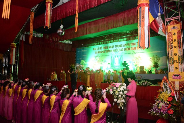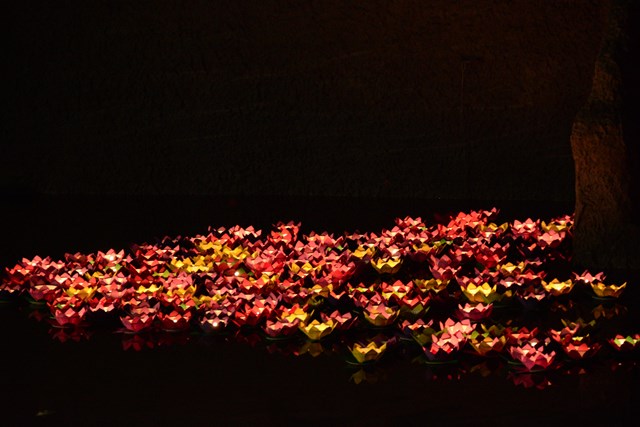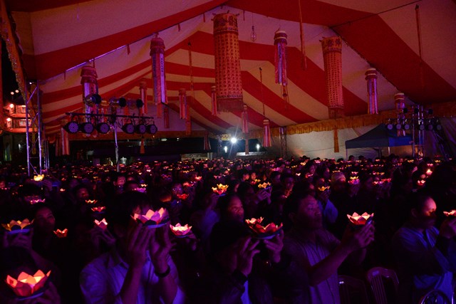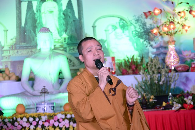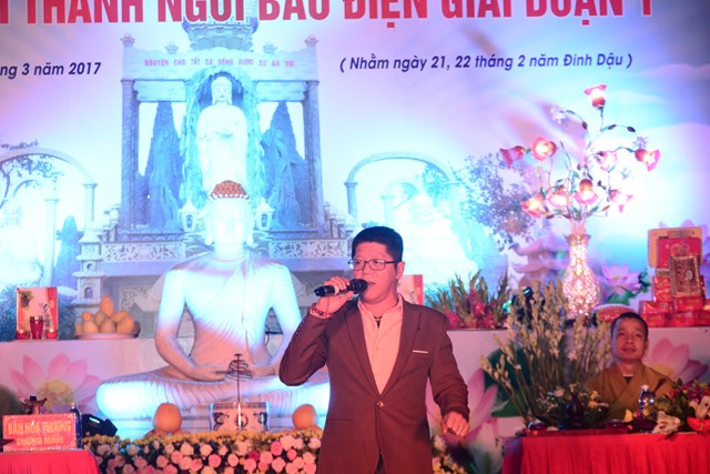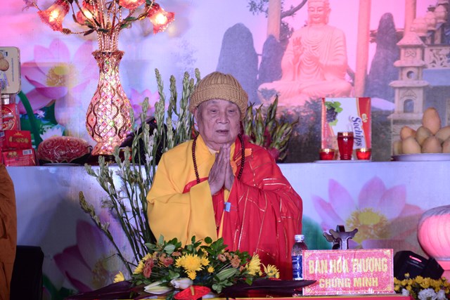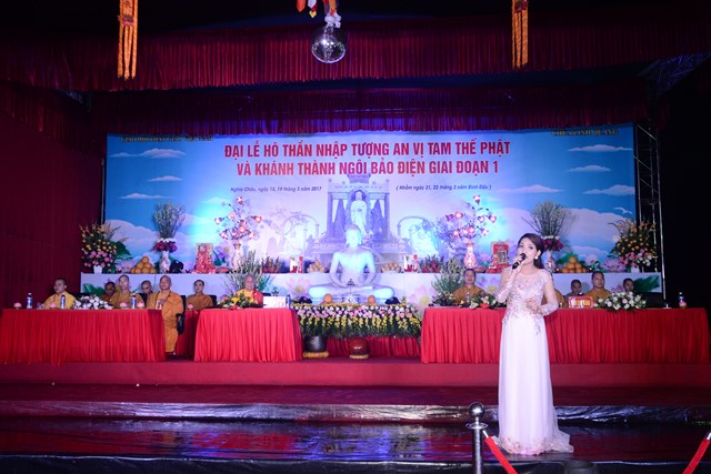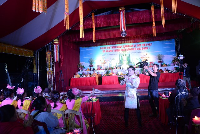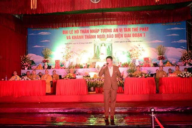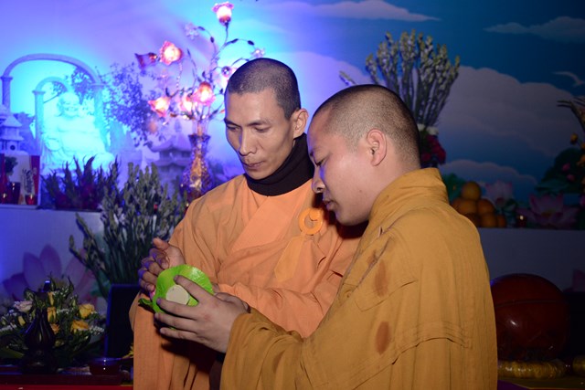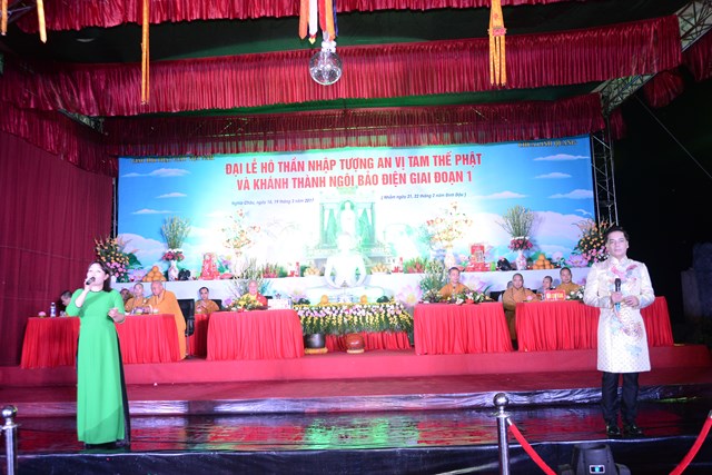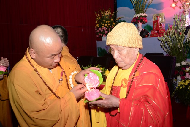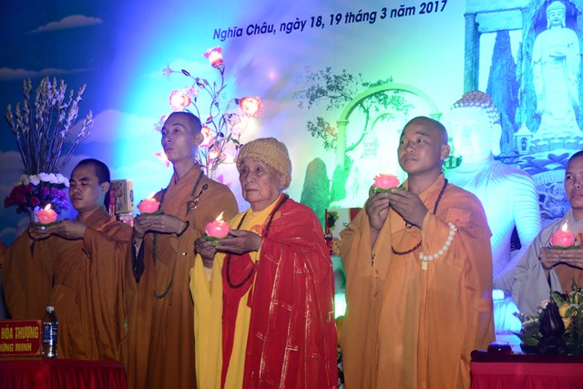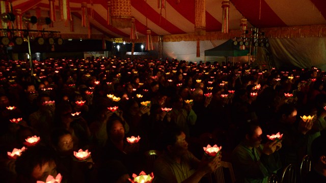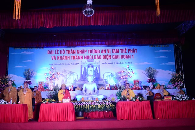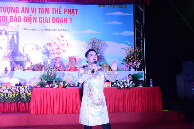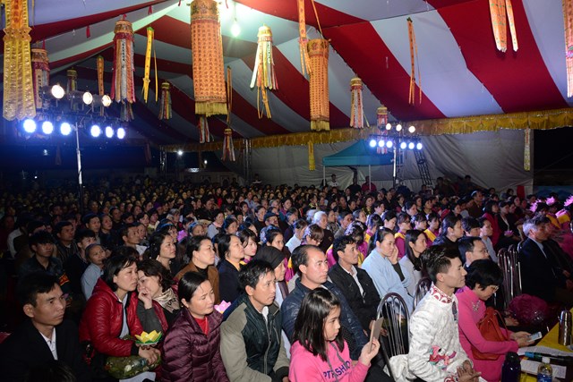 Thời khắc linh thiêng nhất của buổi lễ đã đến khi chư tôn đức chính thức cử hành nghi lễ trì chú an vị tôn tượng Tam thế Phật lộ thiên và hoa đăng cầu nguyện cho thế giới hòa bình, chúng sinh an lạc. Những ngọn nến lung linh huyền ảo đã được dần dần thắp sáng khắp sân chùa làm xóa tan màn vô minh si ám với niềm hy vọng ánh sáng của mười phương chư Phật, ánh sáng của từ bi và trí tuệ sẽ lan tỏa khắp muôn nơi mang đến niềm an vui cho mọi người nhân dịp xuân mới.