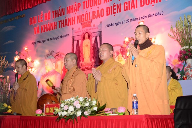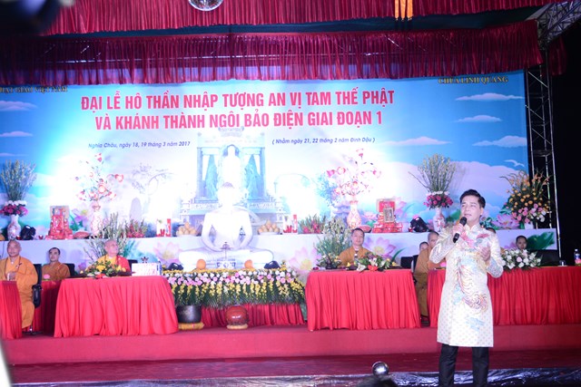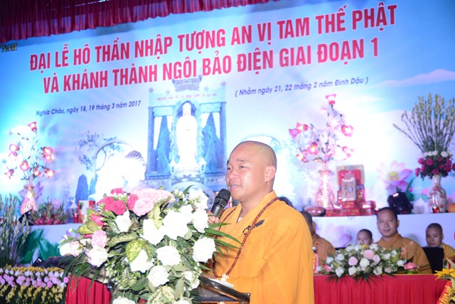 Sau nghi thức niệm Phật cầu gia bị, Đại đức Thích Minh Thành – Trụ trì chùa Linh Quang, trưởng BTC đại lễ đã lên phát biểu khai mạc Đại lễ khánh thành giai đoạn 1 và an vị điện tam thế Phật chùa Linh Quang. Trong bài phát biểu khai mạc, đại đức trụ trì đã nêu rõ nội dung, ý nghĩa và mục đích của lễ an vị tượng Phật. Sở dĩ, chúng ta phải làm lễ an vị tượng Phật là để chúng ta dồn hết tâm lực của mình vào thánh tượng các Ngài, nếu pho tượng không được làm lễ an vị, chú nguyện thì rất có thể đây sẽ là chỗ trú cho một loài vô hình nào đó. Chính vì vậy, nếu đã làm lễ an vị chú nguyện thì pho tượng đó sẽ không bị một thế giới vô hình nào đó chiếm làm chỗ để chú ngụ nữa.