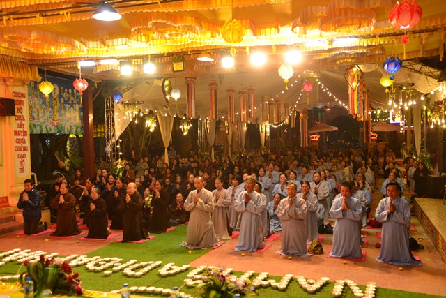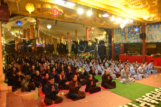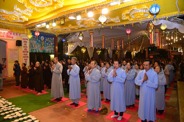 Tiếp đó, toàn thể đại chúng đã lắng đọng tâm tư, cùng quỳ gối chắp tay trang nghiêm, thành kính, hướng tâm thành dâng lên đức Từ Phụ A Di Đà để cử hành nghi thức niêm hương bạch Phật, cầu nguyện thế giới hòa bình, chúng sinh an lạc, âm siêu, dương khánh, Phật pháp được mãi mãi trường tồn.