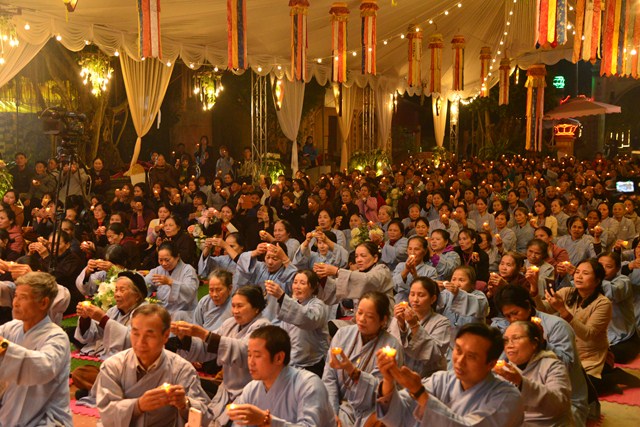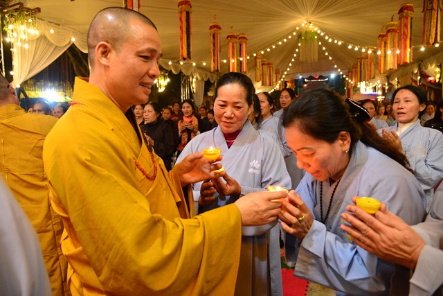 Điểm nhấn của chương trình, cũng là nghi thức mà các Phật tử mong đợi nhất trong đêm kính mừng khánh đản Đức Phật A Di Đà, đó là nghi thức truyền đăng, để cùng dâng ngọn đèn của từ bi, trí tuệ, của sự hiểu biết và tình thương lên đấng Thiện thệ A Di Đà. Khi tiếng nhạc nhè nhẹ vang lên, Thượng tọa Thích Minh Quang và Đại đức Thích Minh Thành đã đón nhận ánh sáng từ Phật đài, sau đó ánh nến đã dần lan tỏa đến chư tôn đức Tăng ni hiện tiền, rồi từ chư tăng truyền trao cho hàng Phật tử. “Nến truyền nến, tâm truyền tâm” – Những ngọn nến biểu tượng của trí tuệ và ánh sáng chân lý đã phá tan màn vô minh si ám, xua tan mùa đông giá rét của miền Bắc, mang theo đó là ước nguyện những ngọn nến của tình thương và sự hiểu biết đó sẽ lan tỏa đến khắp tất cả vạn loại.