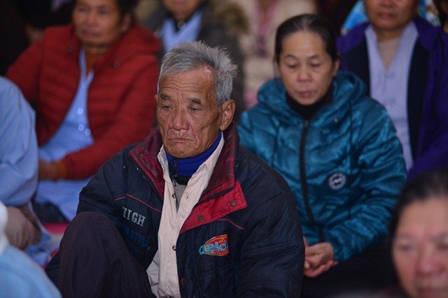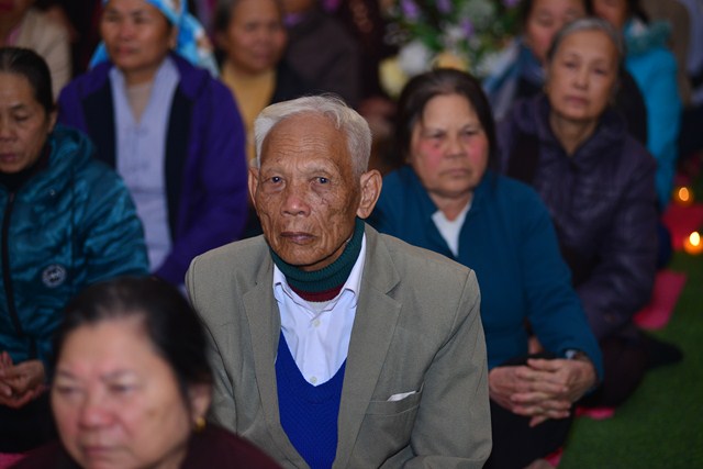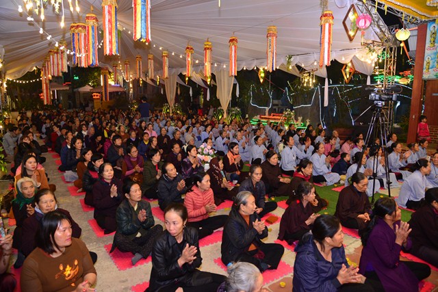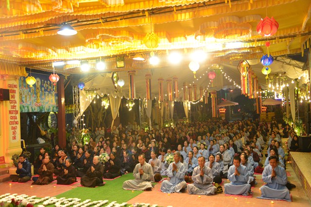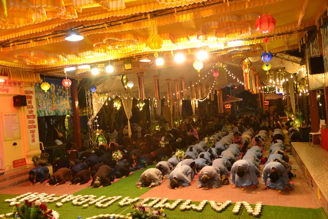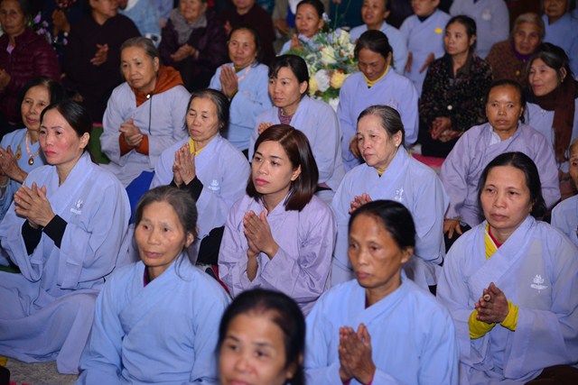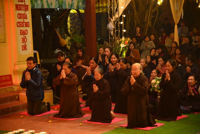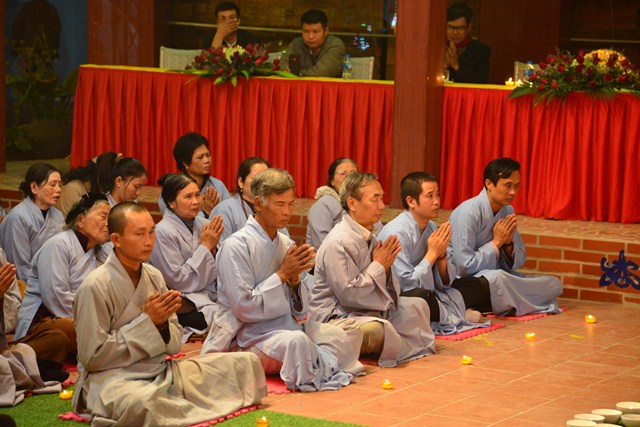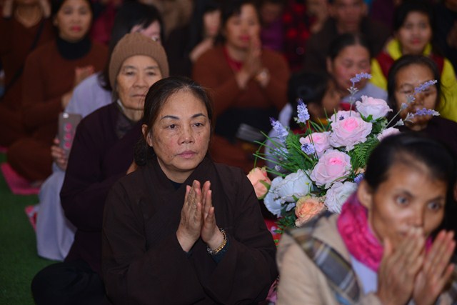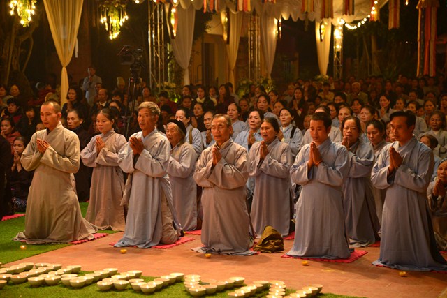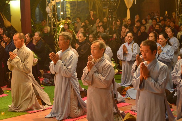 Tiếp đó, toàn thể đại chúng đã lắng đọng tâm tư, cùng quỳ gối chắp tay trang nghiêm, thành kính, hướng tâm thành dâng lên đức Từ Phụ A Di Đà để cử hành nghi thức niêm hương bạch Phật, cầu nguyện thế giới hòa bình, chúng sinh an lạc, âm siêu, dương khánh, Phật pháp được mãi mãi trường tồn.