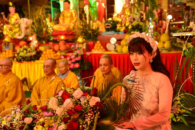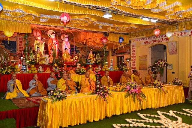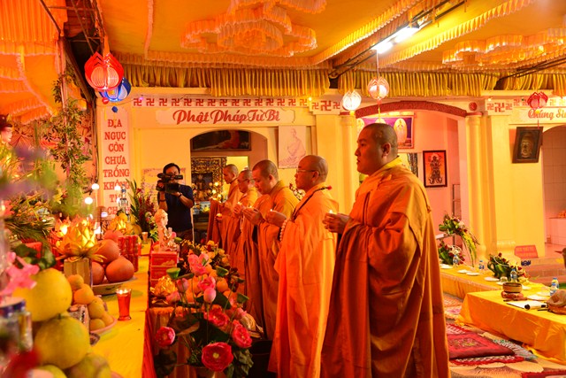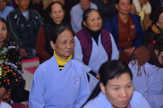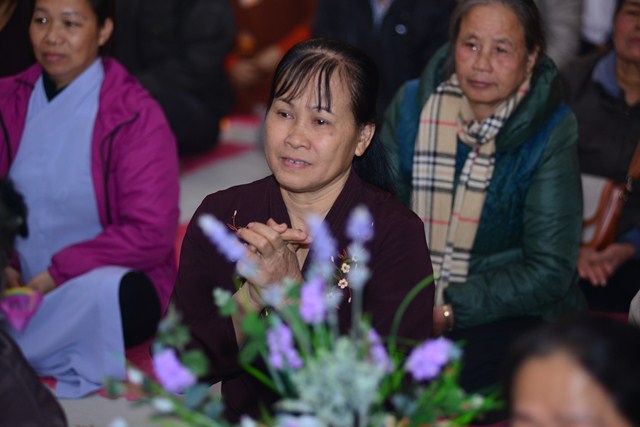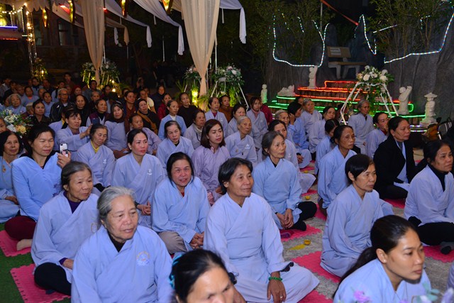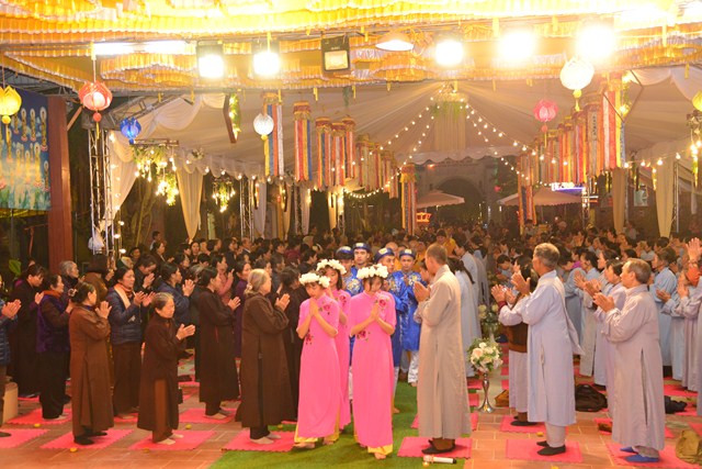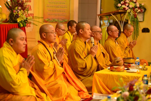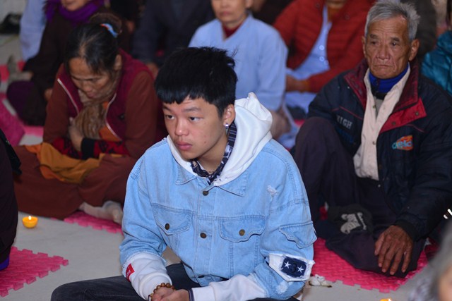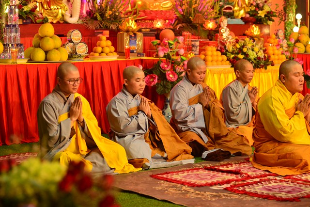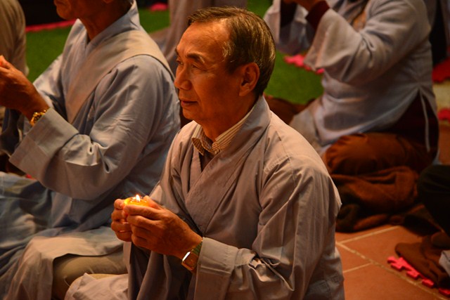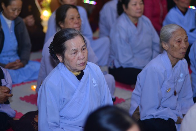 Tiếp đó, toàn thể đại chúng đã lắng đọng tâm tư, cùng quỳ gối chắp tay trang nghiêm, thành kính, hướng tâm thành dâng lên đức Từ Phụ A Di Đà để cử hành nghi thức niêm hương bạch Phật, cầu nguyện thế giới hòa bình, chúng sinh an lạc, âm siêu, dương khánh, Phật pháp được mãi mãi trường tồn.