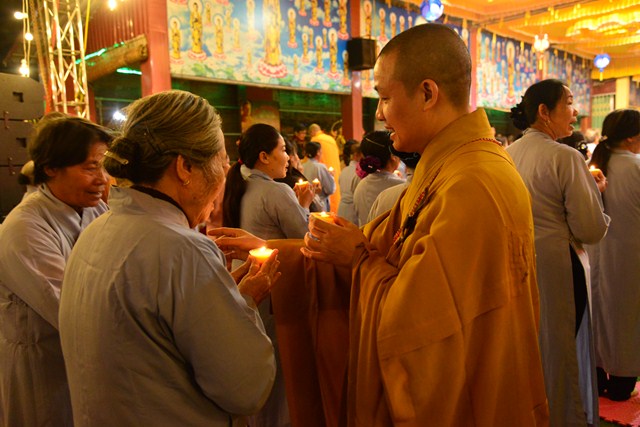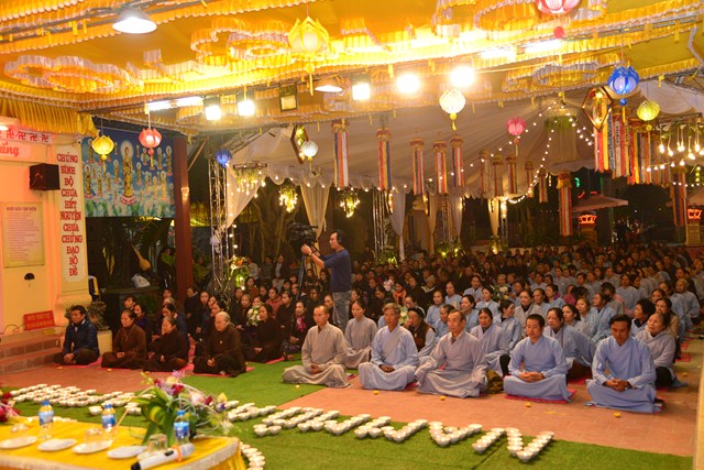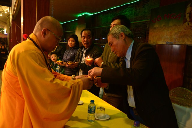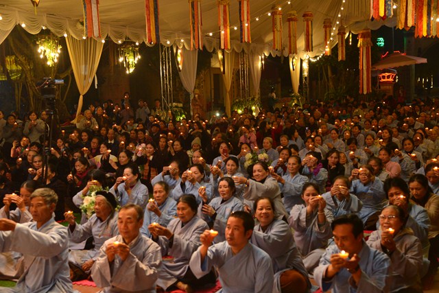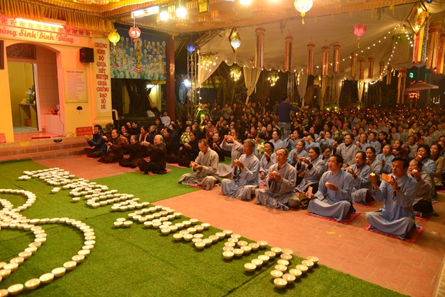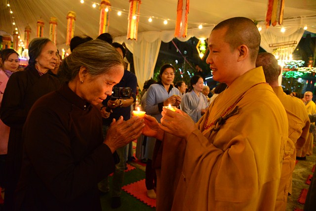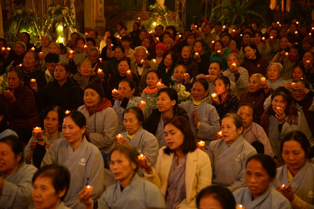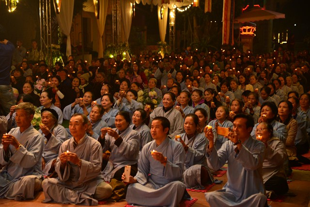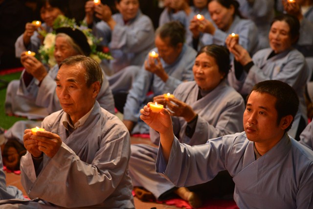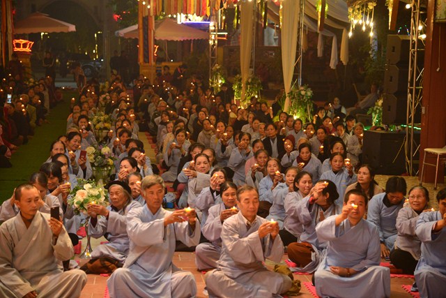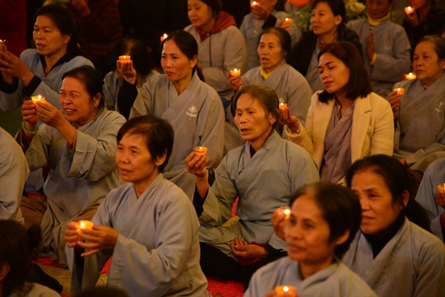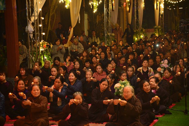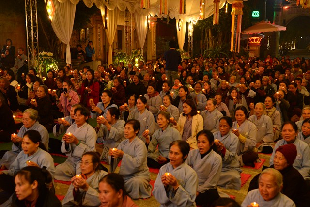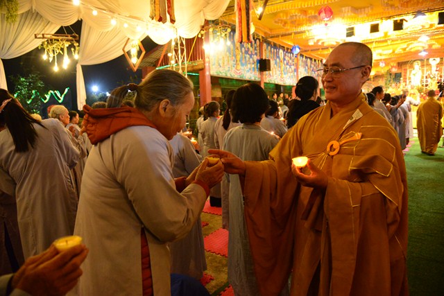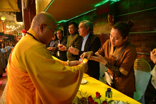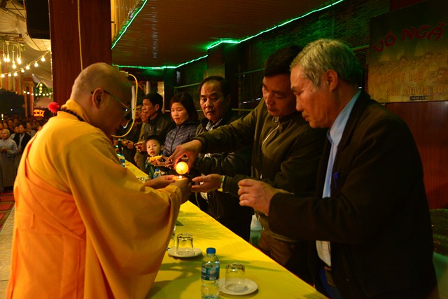 Điểm nhấn của chương trình, cũng là nghi thức mà các Phật tử mong đợi nhất trong đêm kính mừng khánh đản Đức Phật A Di Đà, đó là nghi thức truyền đăng, để cùng dâng ngọn đèn của từ bi, trí tuệ, của sự hiểu biết và tình thương lên đấng Thiện thệ A Di Đà. Khi tiếng nhạc nhè nhẹ vang lên, Thượng tọa Thích Minh Quang và Đại đức Thích Minh Thành đã đón nhận ánh sáng từ Phật đài, sau đó ánh nến đã dần lan tỏa đến chư tôn đức Tăng ni hiện tiền, rồi từ chư tăng truyền trao cho hàng Phật tử. “Nến truyền nến, tâm truyền tâm” – Những ngọn nến biểu tượng của trí tuệ và ánh sáng chân lý đã phá tan màn vô minh si ám, xua tan mùa đông giá rét của miền Bắc, mang theo đó là ước nguyện những ngọn nến của tình thương và sự hiểu biết đó sẽ lan tỏa đến khắp tất cả vạn loại.
