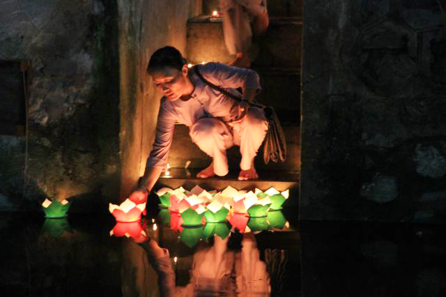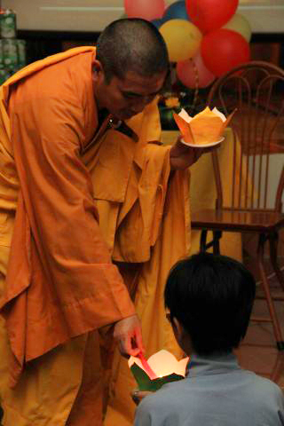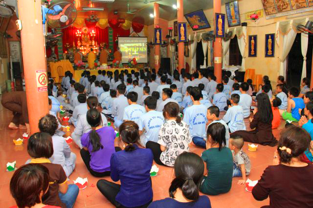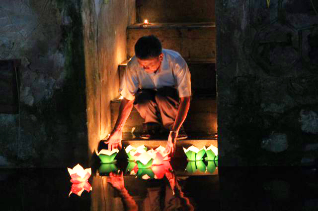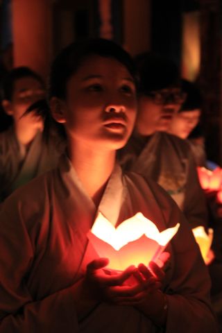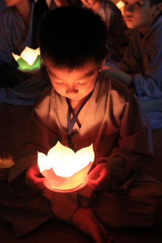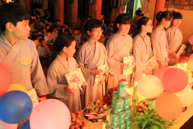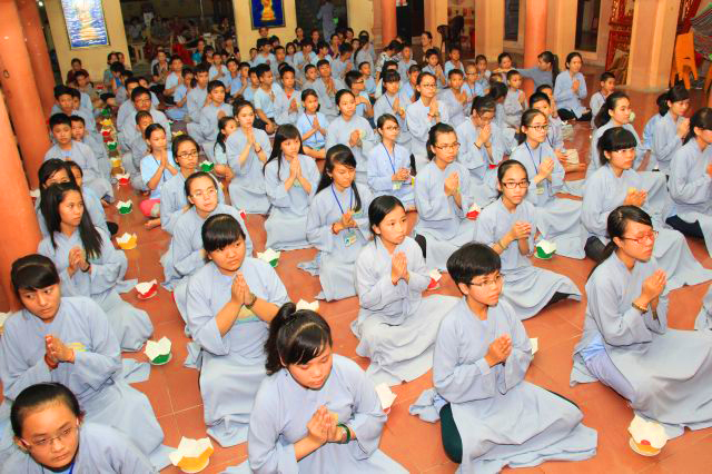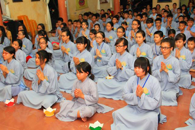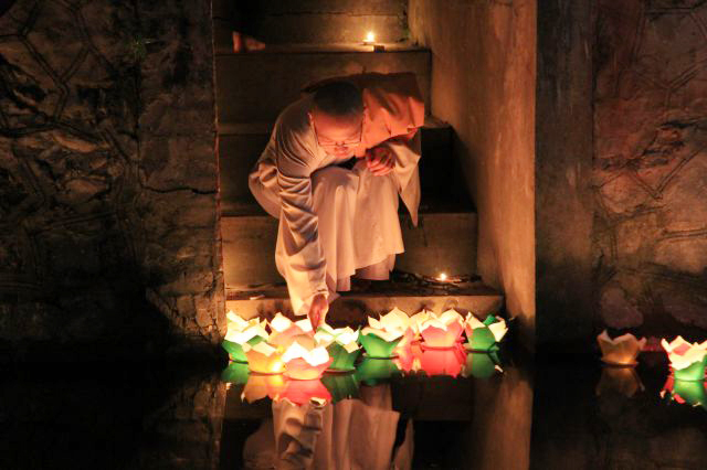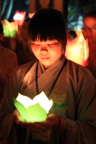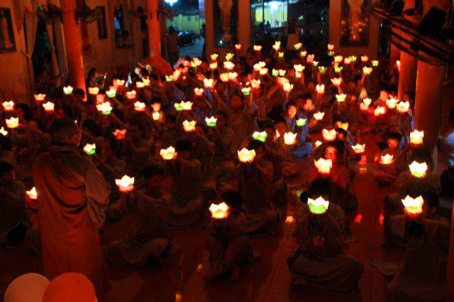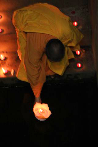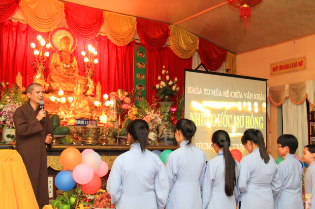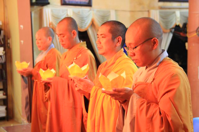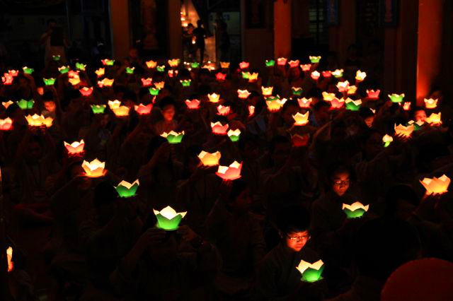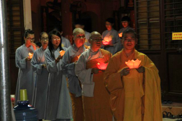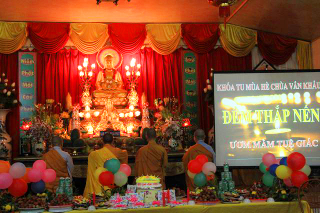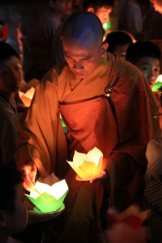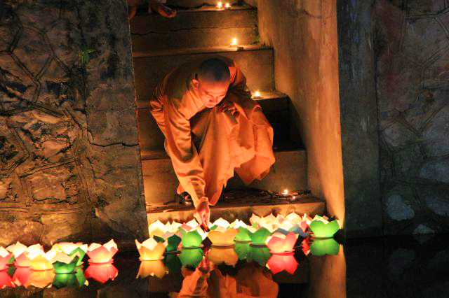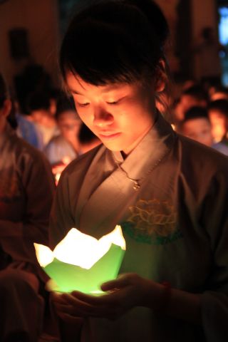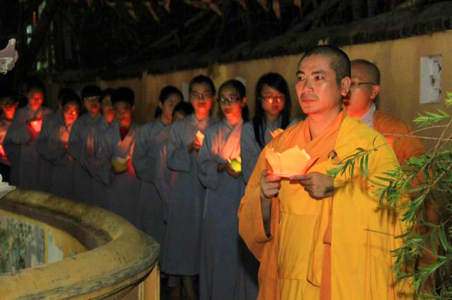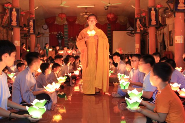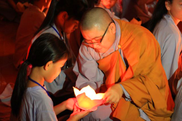 Mở đầu buổi lễ, chư tôn đức niệm hương cầu nguyện quốc thái dân an, các khoá sinh giữ vững tín tâm và sáng suốt trong mỗi hành động của mình. Sau khi chư tôn đức thỉnh ánh đăng quang từ bàn Phật truyền đến cho mỗi bạn trẻ, cả hội trường trở nên lung linh, huyền diệu trong ánh nến và câu thần chú Um ma ni pad me hum. Ánh sáng từ những ngọn nến hồng đưa lên hạ xuống nhịp nhàng theo lời cầu nguyện của các khoá sinh, rồi toả ra khắp sân chùa theo chân đoàn thiền hành. Sau đó những ngọn đăng được thả xuống hồ trong khuôn viên chùa Vấn Khẩu để những ước mơ các bạn gửi gắm có cơ hội bay cao, bay xa.