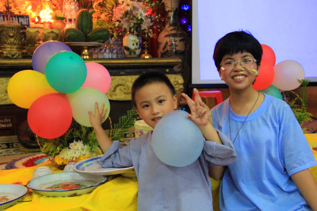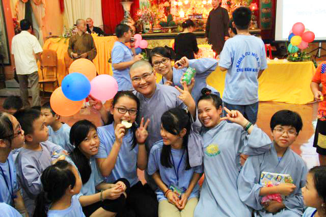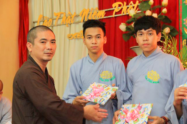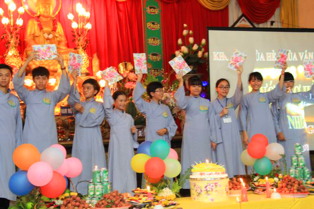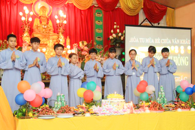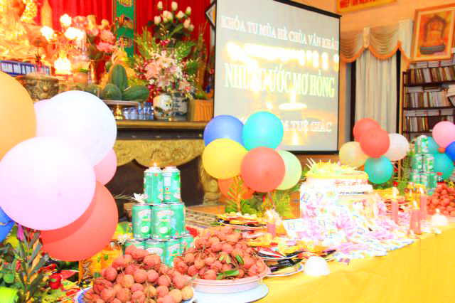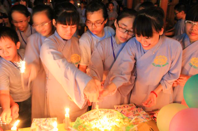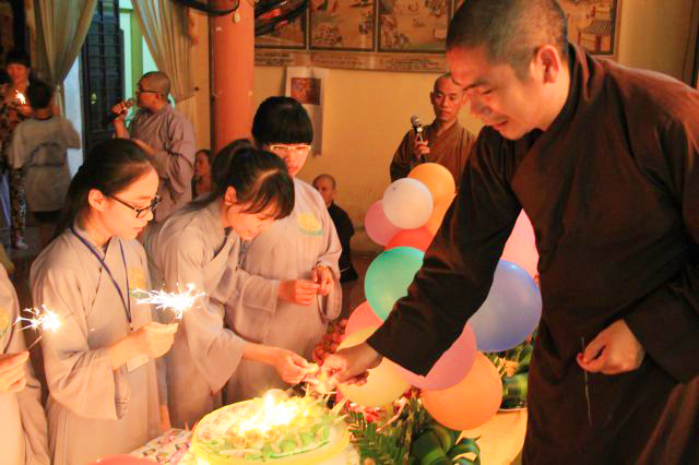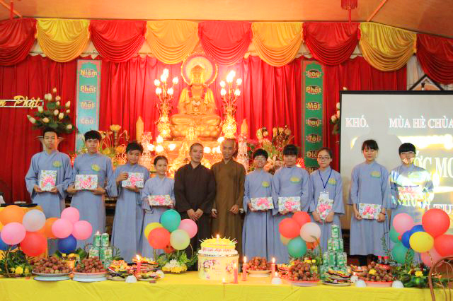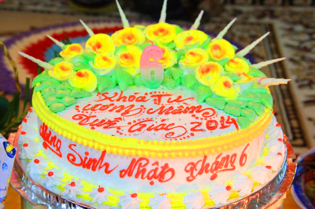 Chương trình chúc mừng sinh nhật diễn ra ngay sau đó. Những bạn có ngày sinh vào tháng 6 hạnh phúc được nhận quà từ tay thầy Trưởng BTC và thầy chủ nhiệm khoá tu. Chiếc bánh sinh nhật được chia sẻ với tất cả khoá sinh, là cơ hội để các bạn ngồi lại bên nhau thân mật và gần gũi.
