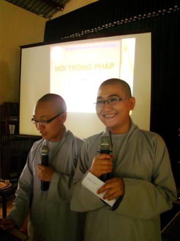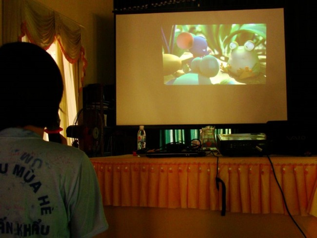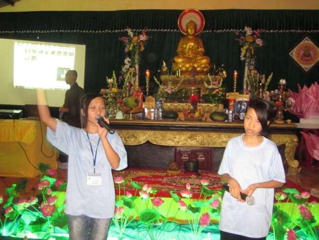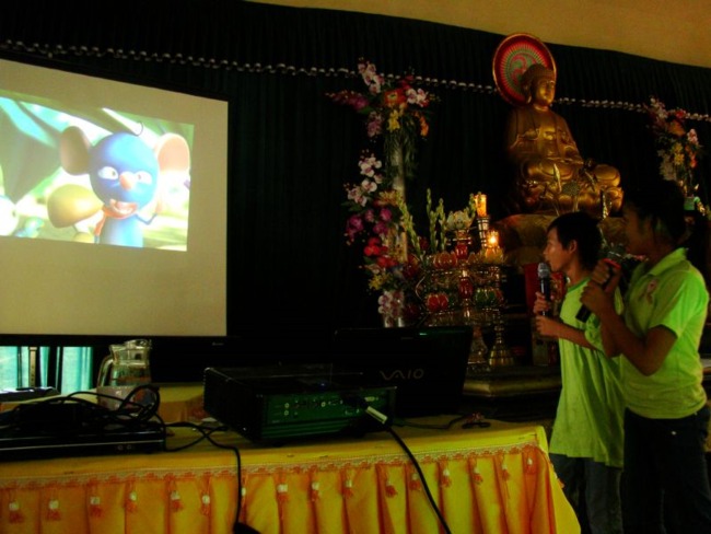 Sau phần thi Phật pháp, các khóa sinh đền với chươn trình Làm người thuyết minh cho phim hoạt hình để thực tập kiến thức làm MC mà các em đã được học. Các bạn ngồi chăm chú theo dõi bộ phim hoạt hình Dưới bóng cây và trổ tài thuyết minh thật hào hứng.