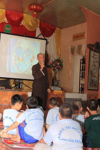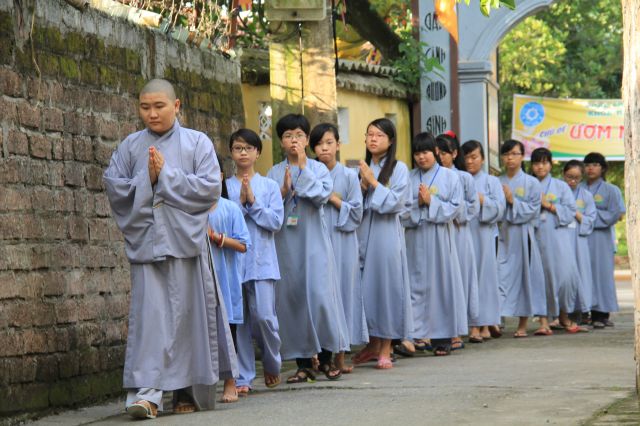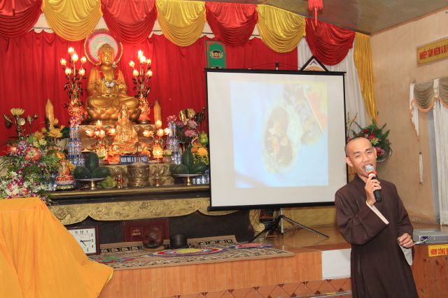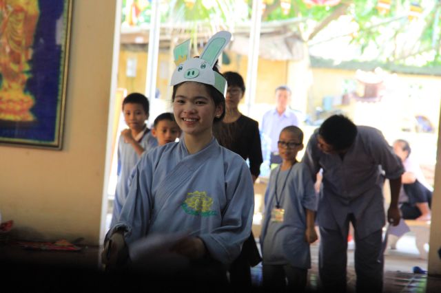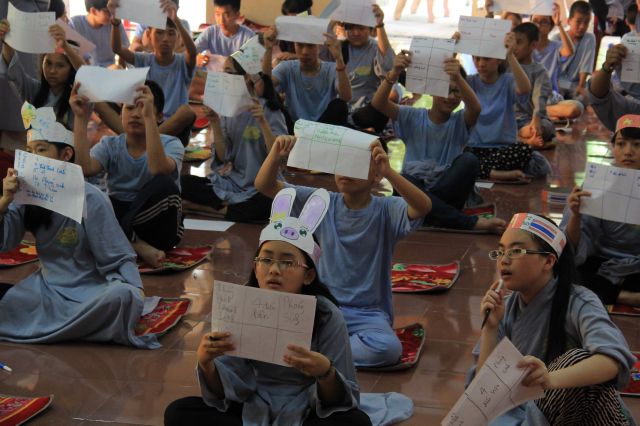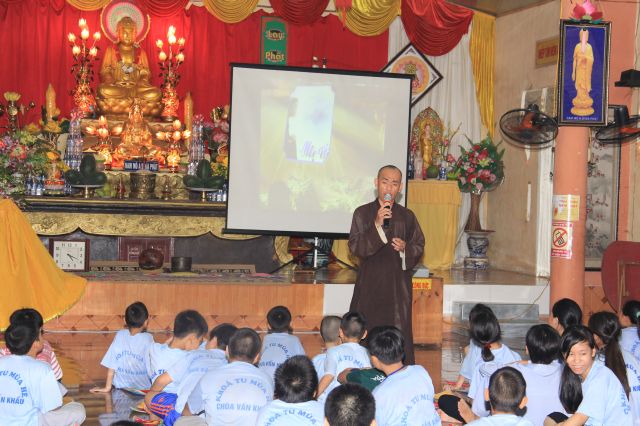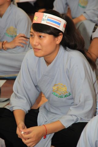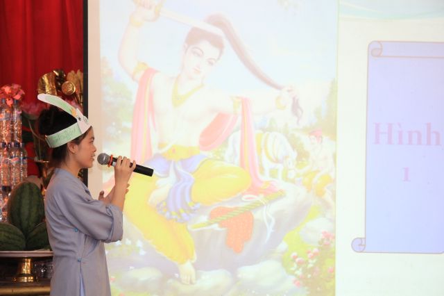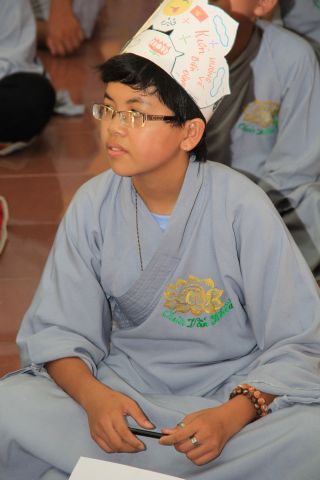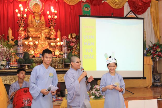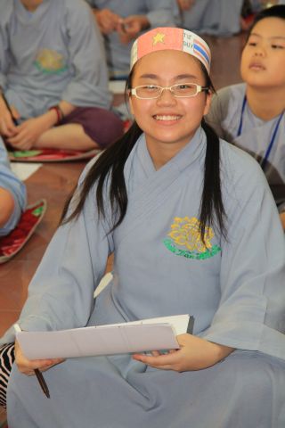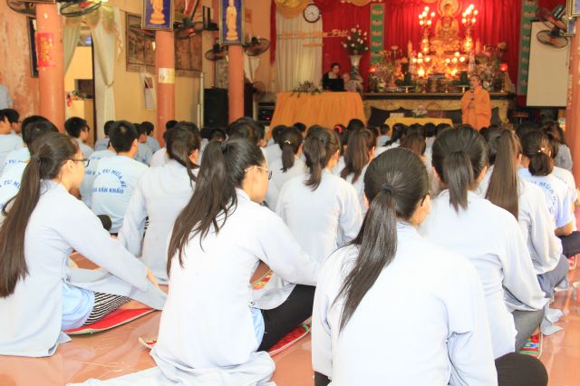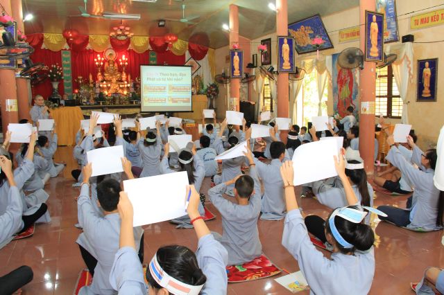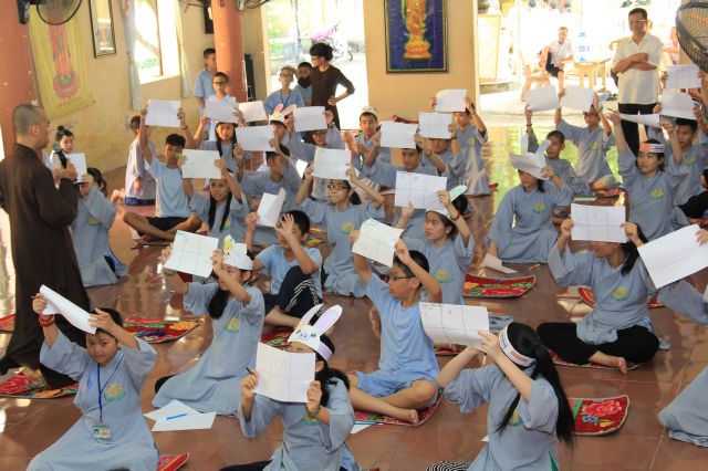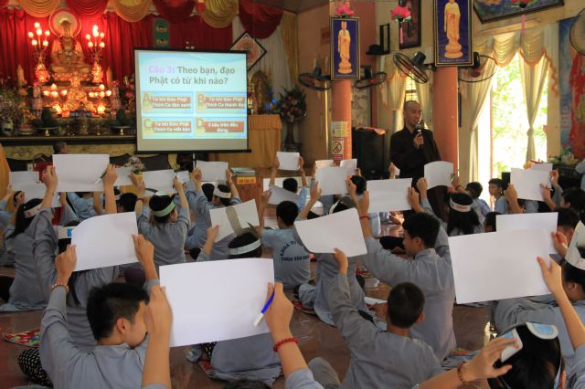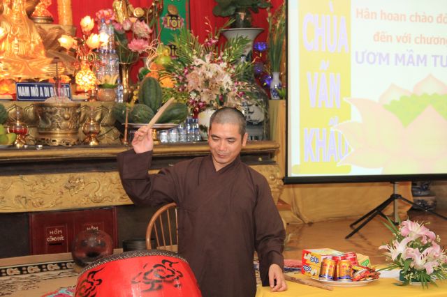 Buổi sáng, các bạn hân hoan chào đón Đại đức Thích Thanh Linh – Trụ trì chùa Vấn Khẩu, cũng là trưởng BTC đến thăm hỏi, chia sẻ với các khoá sinh. Thầy ân cần hỏi thăm và dặn dò khoá sinh, mong các bạn trẻ biết trân quý giây phút hiện tại vì thời gian một khi trôi qua thì không cách gì quay trở lại. Các bạn trẻ bùi ngùi, rưng rưng khi nghe thầy nhắc thời gian tu học ở chùa sắp kết thúc. Không khí trầm lắng chỉ hiện hữu trong phút giây ấy, sau đó các bạn lại trở nên sôi động và hào hứng như vốn có khi bước vào cuộc thi “Ươm mầm tuệ giác”. Những vòng thi được nối tiếp trong tiếng vỗ tay reo hò của thí sinh và cổ động viên. Các kiến thức được quý thầy cô trao truyền trong suốt khoá tu lần lượt được các em thể hiện lạitrong phần trả lời của mình, để các em có cơ hội ôn lại lần cuối trước khi rời khỏi khoá tu.