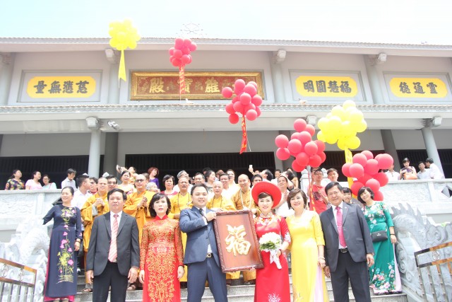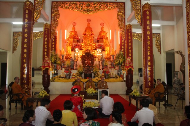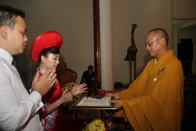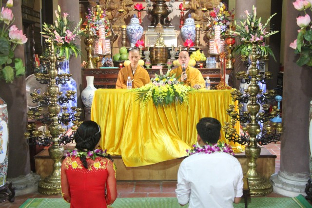 Tại buổi lễ, chư Tăng đã tác pháp quy y Tam Bảo và trao truyền Ngũ Giới để tân lang, tân nương làm kim chỉ nam cho cuộc sống hiện tại, trở thành những người con Phật, gia đình Phật tử sống đúng với năm chuẩn mực đạo đức xã hội, là con dâu hiền, rể thảo. Chúc tân lang tân nương “Sắt cầm hòa hợp – Loan phụng sum vầy – Bách niên giai lão”.