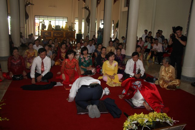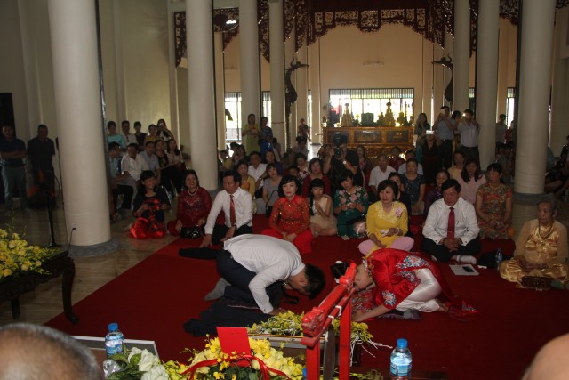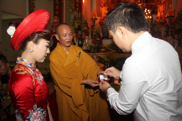 Tiếp đó, các bạn đã đối trước Tam Bảo đọc lời thệ nguyện yêu thương nhau trọn đời và hộ trì chính pháp; đảnh lễ công ơn sinh thành, dưỡng dục của song thân; đảnh lễ tôn trọng sự bình đẳng của nhau. Sau đó, đích thân nhị vị Thượng tọa trao nhẫn và trao quà cưới cho hai bạn. Trong niềm hoan hỷ của buổi lễ, quý Thầy đã khuyến tấn tân lang, tân nương phải sống trọn vẹn bổn phận làm vợ và làm chồng, làm dâu hiền, rể thảo cùng xây dựng hạnh phúc gia đình theo tinh thần kinh Thiện Sinh.