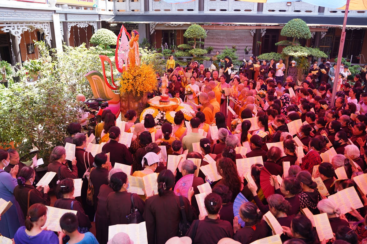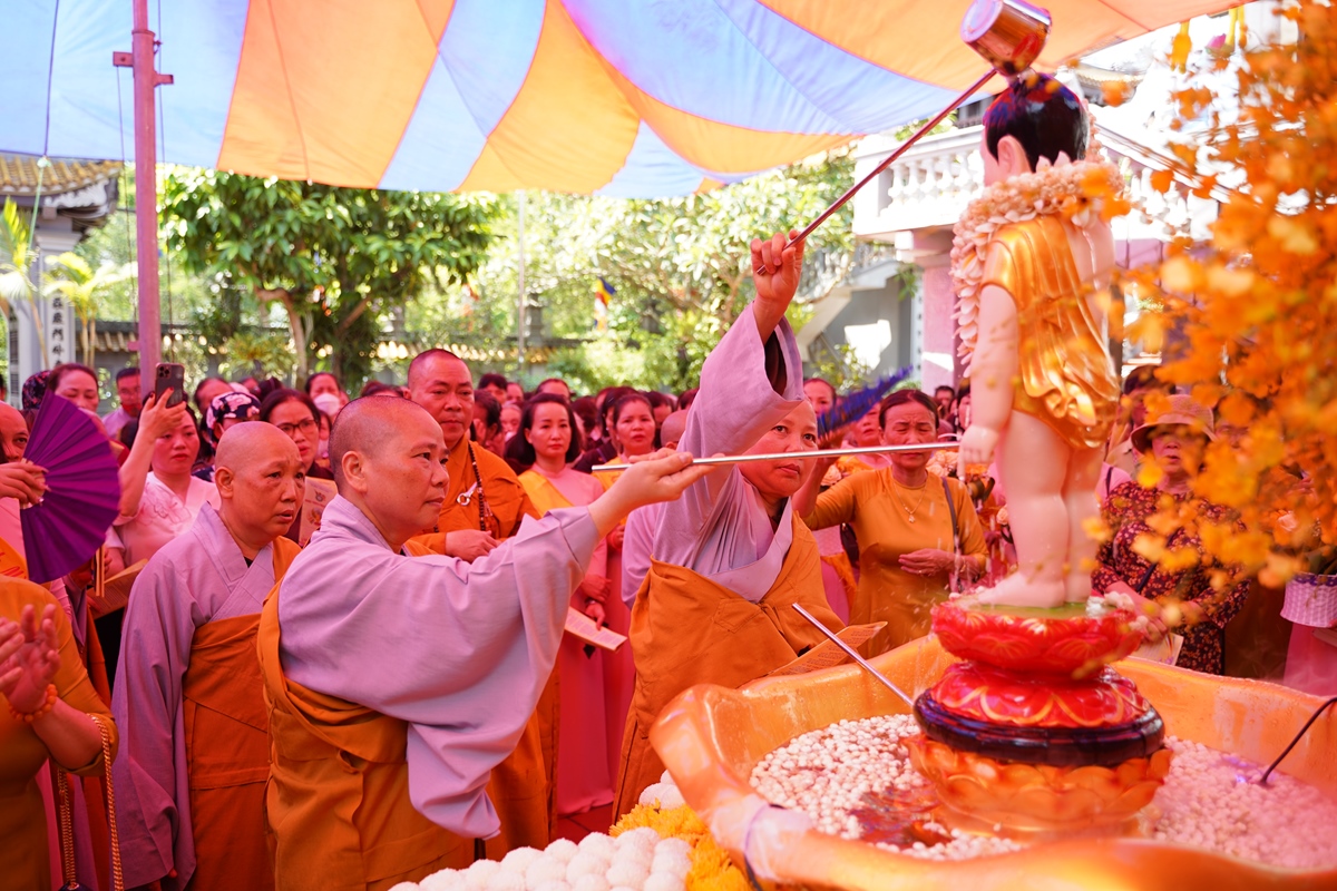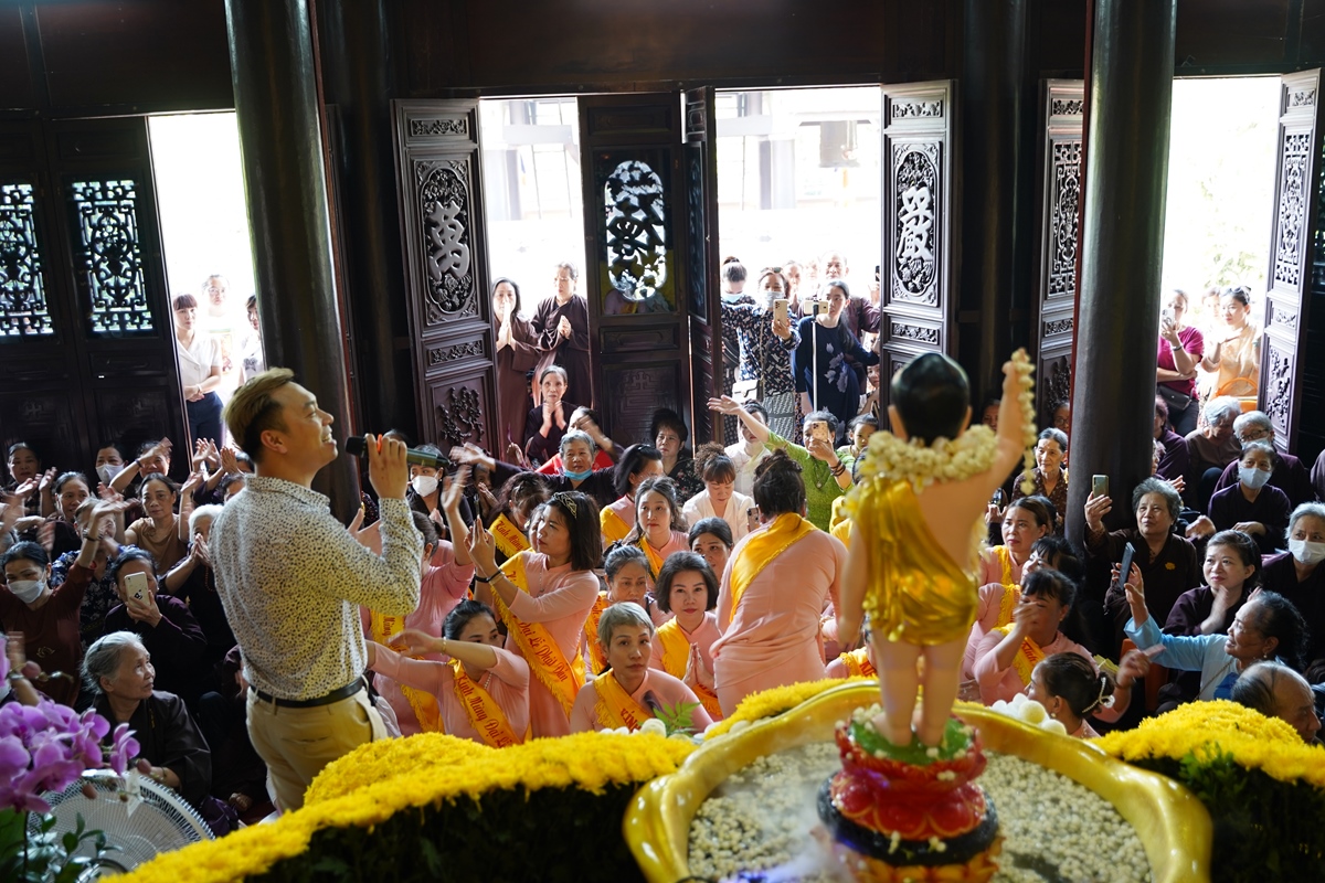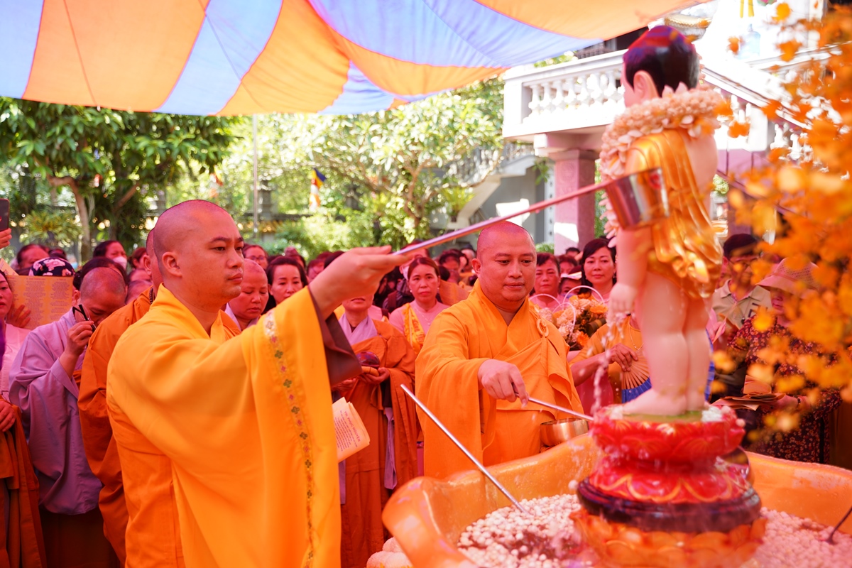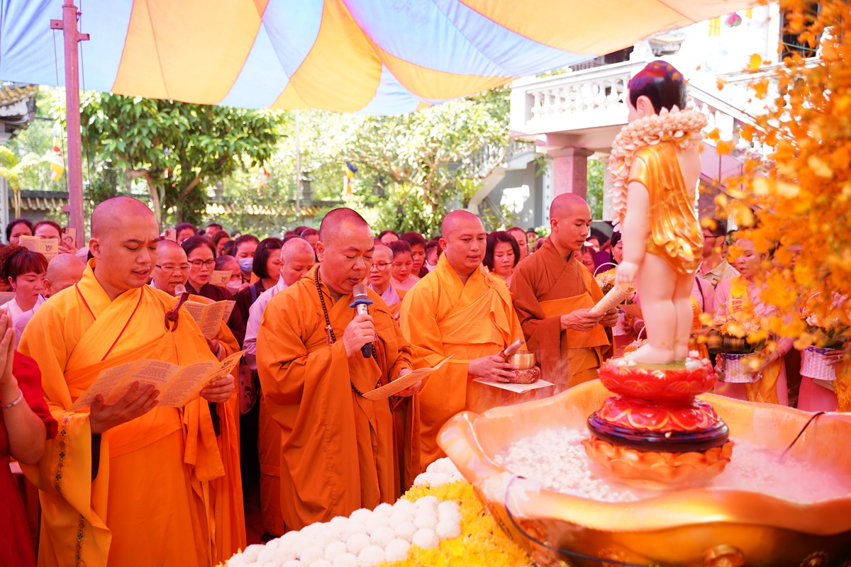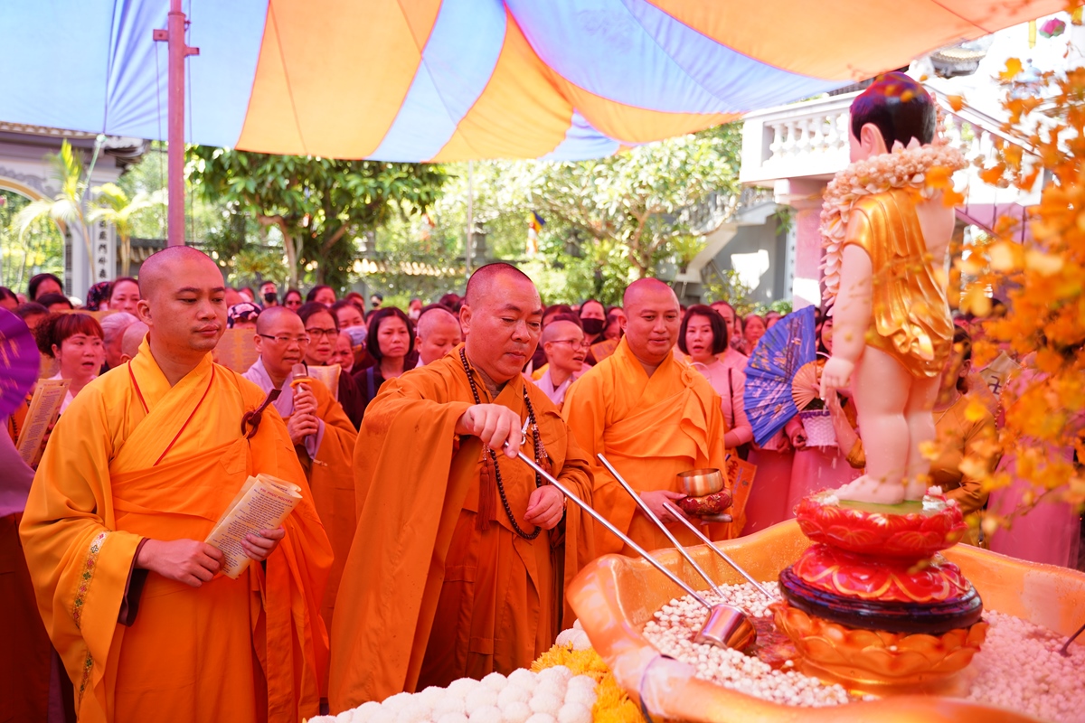 Sau đó là giây phút thiêng liêng nhất của mỗi người con Phật. Trước kim thân Đức Phật sơ sinh, Chư Tôn đức chứng minh đã thành kính niêm hương bạch Phật, tụng kinh Phật đản và làm lễ mộc dục trong tiếng niệm Phật âm vang của toàn thể hội chúng.