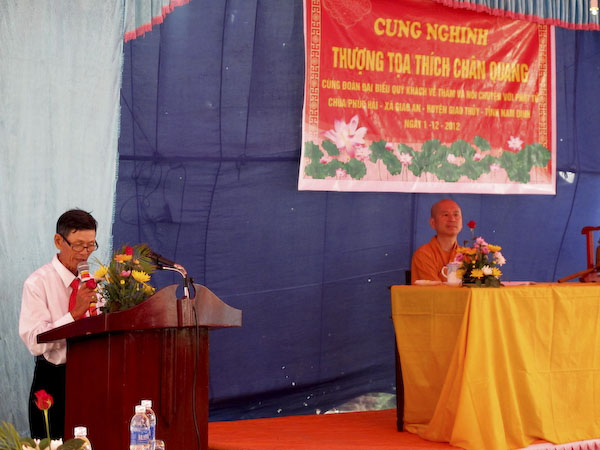Mở đầu là nghi thức niệm Phật cầu gia bị. Tiếp đến, Sư thầy Trụ trì có đôi lời vấn an TT.Thích Chân Quang và một vị trong Ban Tổ Chức nhà chùa đã giới thiệu đôi nét về mảnh đất – con người của làng quê và sự phát triển hình thành của ngôi chùa Phúc Hải. Được biết, chùa Phúc Hải tọa lạc trong quần thể khu di tích Lịch sử Văn hóa Đình Chùa làng Hoành Lộ – xã Giao An – huyện Giao Thủy – tỉnh Nam Định, đã được xây dựng trên 100 năm. Đến nay chùa xuống cấp trầm trọng. Vừa qua, được sự cho phép của các cấp Ban ngành trong tỉnh và Giáo hội Phật giáo huyện Giao Thủy, tỉnh Nam Định, chùa Phúc Hải đã khởi công xây dựng lại vào tháng 05/2012, dự kiến tổng kinh phí xây dựng là trên 3 tỷ đồng. Hiện nay chùa xây dựng được 2/3, đã xong phần thô công trình.