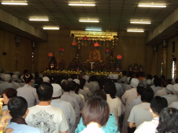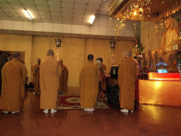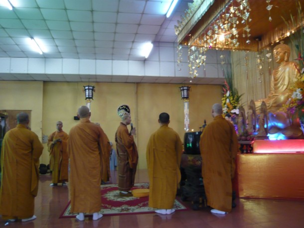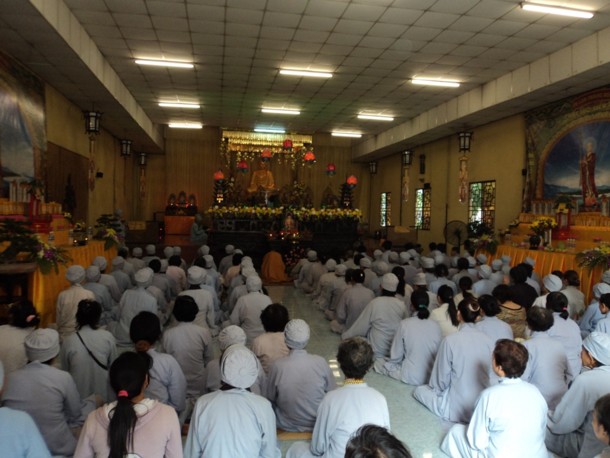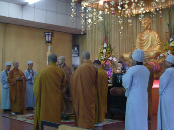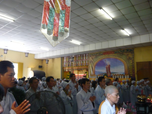 9 giờ sáng, chư Tăng đã làm lễ khai kinh, niệm Phật, cúng Phật. Trong không khí trang nghiêm và uy linh của tiếng chuông đại hồng, đại chúng đã cất cao tiếng niệm Phật và câu kinh cho tất cả thai nhi bị phá.
