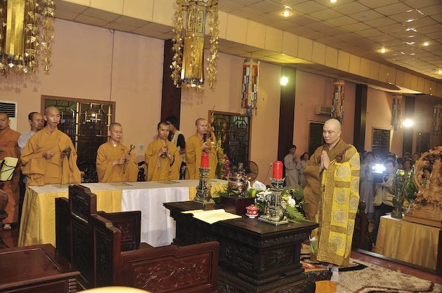Theo chương trình, trong buổi sáng, HT. Thích Thiện Tấn – trụ trì chùa Từ Thoàn làm đương vi sám chủ cùng với chư tôn đức ban kinh sư đã cử hành khóa lễ niêm  hương bạch Phật, khai chung bảng và thượng đại tràng phan.