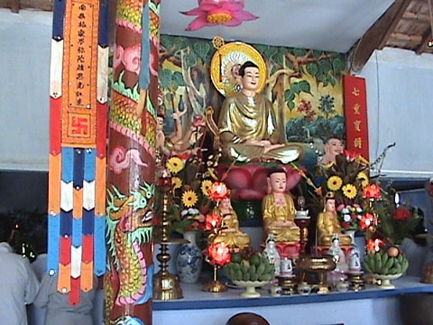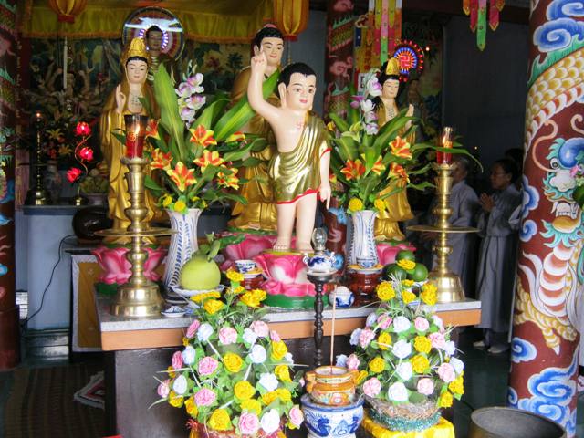 Mùa Phật đản PL.2556 (2012) nhân duyên được phật tử phát tâm cúng dường ba pho tượng Tam thế: Phật A Di Đà, Phật Quán Thế Âm, Phật Đại Thế Chí và pho tượng Phật Di Lặc.