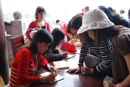 Sờ tay vào ngòi bút của tượng La Hán, mong đường công danh được suôn sẻ