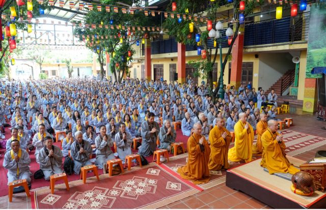 Đúng 7h30, Hòa thượng Thích Bảo Nghiêm – Phó Chủ tịch HĐTS, Trưởng Ban Hoằng pháp TƯ, trụ trì chùa Bằng đã quang lâm niêm hương bạch Phật, yết Tổ và đăng đàn truyền giới Bát Quan Trai cho hàng Phật tử phát tâm tu tập trong ngày. Đây cũng là dịp để đại chúng cùng tưởng niệm mùa Vu Lan báo hiếu, thành tâm hướng về tứ trọng ân: ơn Tam Bảo, ơn đất nước, ơn cha mẹ sinh thành, và ơn pháp giới chúng sinh. Với tấm lòng chí thành chí kính, toàn thể Đạo tràng đã dành 3 phút thiêng liêng vận tâm thanh tịnh để cung thỉnh Việt Nam trăm họ chư vị tổ tiên, Việt Nam chư vị anh hùng liệt sĩ hương linh cùng về Đạo tràng tụng kinh, tu tập với đại chúng.