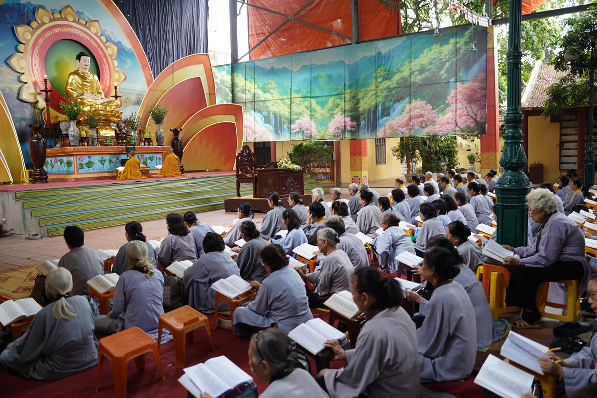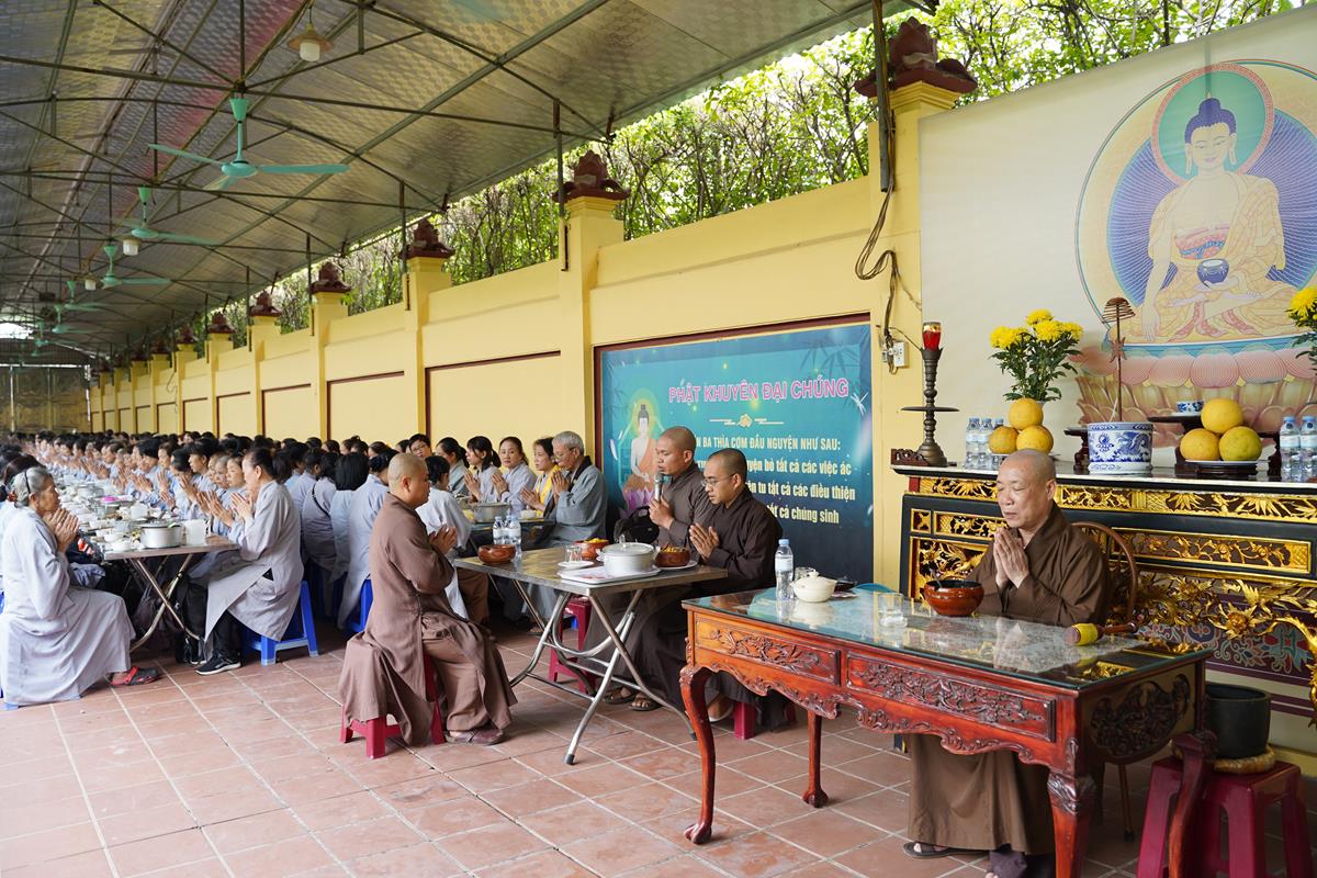 Buổi trưa, đại chúng thực hiện nghi thức cúng Quá Đường, dùng cơm chay trong chính niệm tỉnh thức. Đầu giờ chiều, đại chúng tiếp tục trì tụng Bổn Môn Pháp Hoa Kinh cầu quốc thái dân an, khép lại ngày tu bát quan trai tràn đầy hỷ lạc.