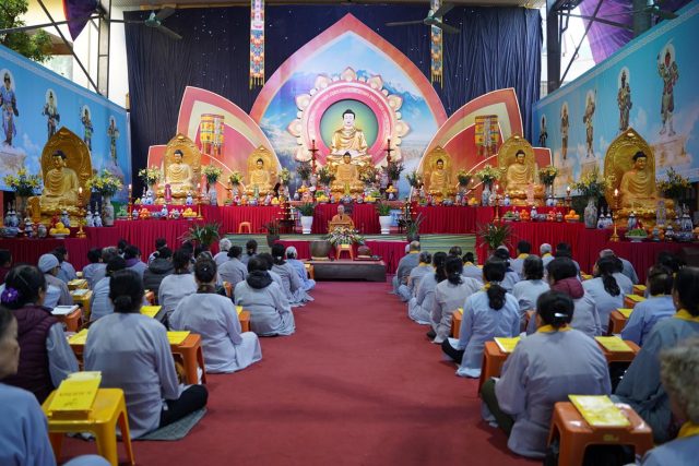 Thượng tọa Giảng sư nhấn mạnh “Chúng ta về tu tập, không chỉ hành trì, lễ bái, cầu nguyện; mà ta hãy mở tâm mình ra. Như vậy có công đức, công đức lúc cần hiển bày thì hiển bày, lúc không cần thì không hiển bày. Phật tử càng tu càng sáng, càng thấy được giá trị của sự tu hành, tâm mình rộng lớn, vì Phật pháp, vì lợi ích cho chúng sinh: những chúng sinh có mặt và cả những chúng sinh khuất mặt, không thấy hình tướng. Trên bước đường tu, các Phật tử tu theo Bổn Môn Pháp Hoa, kham nhẫn trước những điều bất như ý, hành Bồ tát đạo để dấn thân phụng sự trong nhiều đời nhiều kiếp. Mỗi người hiện diện trong lễ đường đây là phúc đức hơn rất nhiều người khác, đã không còn nặng nề về vật chất. Vì vậy, cần tận dụng thời gian ở chùa để tu cho công đức tăng trưởng. Còn sức khoẻ, minh mẫn, đi được, nói được hãy hết lòng. Khi vô thường đến, buông xuống, không còn luyến tiếc điều gì cả. Vì ta đã sống trọn một cuộc sống ý nghĩa phụng sự nhân sinh”.