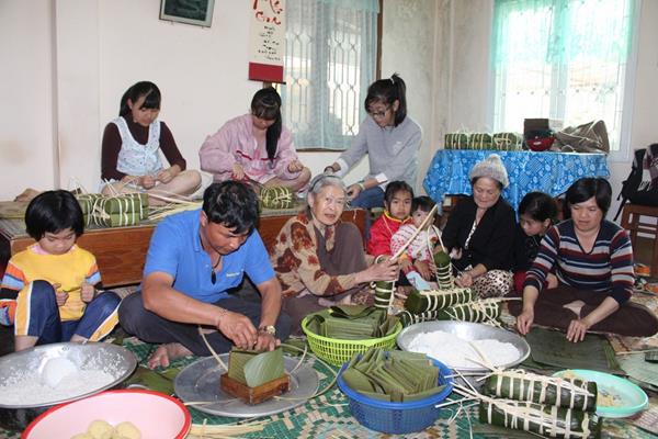 Ngồi trò chuyện với chúng tôi bà chia sẻ: “…nhà thì không có gì, nhờ con cháu mỗi đứa góp chút chút nên có bao nhiêu thì làm bấy nhiêu, ngừng một lát như để hồ tưởng, bà nói tiếp : “ ăn thì không bao nhiêu, chủ yếu gói để có cái biếu cho bà con hai họ, rồi có cái để mời khách khi họ đến nhà chơi. Điều này, nó ngấm vào máu thịt của chúng tôi rồi, tới tết mà không gói bánh thì thấy buồn, như thiếu một cái gì đó. Với vợ chồng tôi thì đó mới là tết, vì con cháu được đoàn tụ với ông bà, mọi người cùng quay quần bên nhau dọn dẹp nhà cửa, gói bánh đón tết, không khí ấm áp lắm,…” .