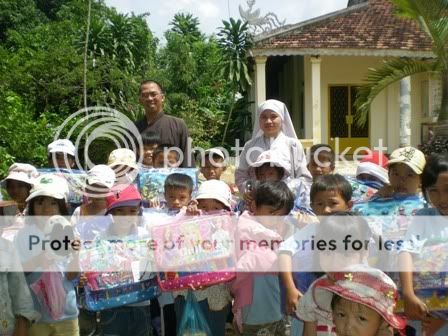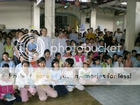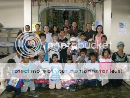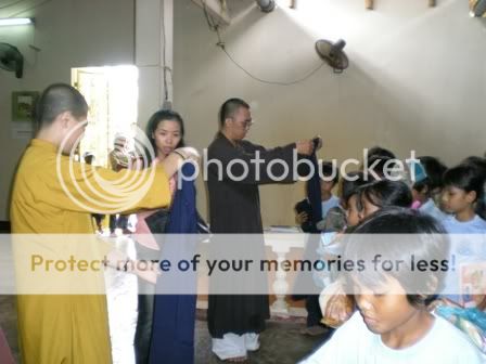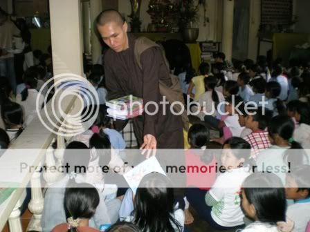 Theo chương trình sinh hoạt, hôm nay, CLB phát dụng cụ học tập cho các em, nên các lớp học đều đựơc kết thúc sớm hơn mọi khi. Các em được quý thầy cô hướng dẫn lên chùa lạy Phật, đọc những lời tâm nguyện. Nhìn các em chấp tay thành kính hướng về Tam Bảo, lòng tôi cảm thấy dấy lên niềm an lạc kỳ lạ. Quả là không uổng công mọi người đã bỏ bao công sức, thời gian và tiền bạc để đến với các em. Các em luôn nở nụ cười sung sướng khi cầm trên tay những quyển tập, những bìa giấy bao, những cây viết và phần bánh sửa như ngày nào.