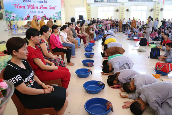 Trong lễ bế mạc, Ban Tổ Chức cho các em thực hiện nghi lễ cài hoa hồng, rửa tay chân, tạ ơn đấng sinh thành và trao thưởng cho các tu sinh có thành tích xuất sắc trong cuộc thi ngồi thiền, tụng kinh do Nhà Chùa tổ chức
