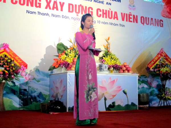 Sau cùng, cô Đoan Tuệ – Chúng trưởng đạo tràng Phật An – Phó Ban Hộ Tự chùa Viên Quang thay mặt BTC nói lời cảm tạ và tri ân Chư tôn đức GHPG Nghệ An, các cấp chính quyền, các ngành chức năng, các vị đại biểu, các cơ quan báo chí, các nhà hảo tâm, Tổng Đạo Tràng Phật Quang cùng các đạo tràng bạn, Đoàn Thanh Phật Quang Hà Nội, Huế, Hải Phòng, các công ty quảng cáo tổ chức sự kiện, âm thanh và toàn thể Phật tử… Tất cả đã nhiệt tình giúp đỡ, ủng hộ, góp phần tạo nên sự thành công của buổi lễ./.