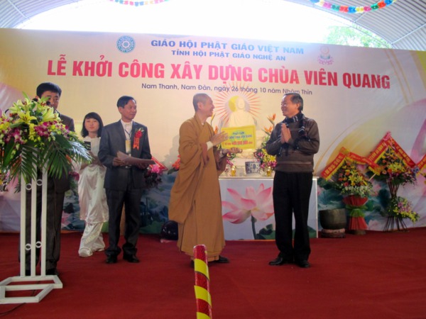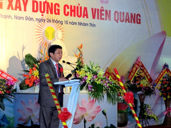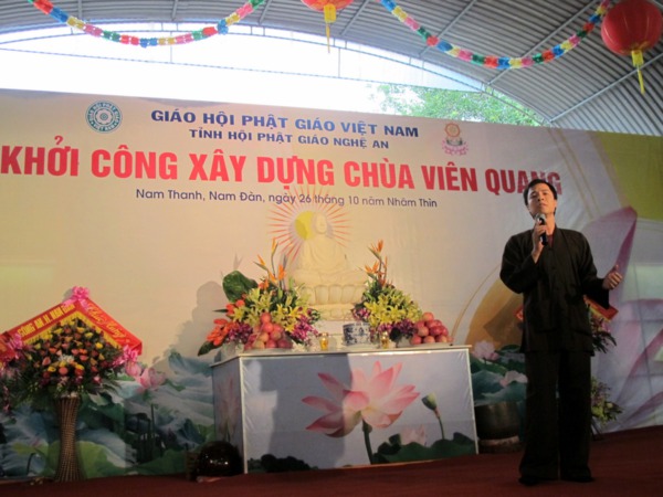 Tiếp theo, ông Ngô Minh Tơn thay mặt toàn thể Phật tử nói lên cảm nghĩ, tâm nguyện của mình trong ngày lễ trọng thể này. Ông phát biểu “Hôm nay là ngày vô cùng trọng đại đối với Phật tử Nghệ An, tại đây chúng con được chào đón sự kiện đặc biệt đó là lễ khởi công xây dựng tu tạo lại cổ tự Viên Quang. Chúng con nhớ lại câu thơ nổi tiếng của HT Mãn Giác “Mái chùa che chở hồn dân tộc, nếp sống muôn đời của Tổ tông”. Mái chùa đã trở thành điểm tựa tâm linh, nơi gửi gắm tâm hồn của người dân Việt. Đó cũng là truyền thống, là nếp sống từ ngàn năm qua ông cha ta đã để lại cho các thế hệ con cháu. Thế rồi năm tháng dần trôi, lịch sử hào hùng cũng dần qua, nhưng vẫn còn nỗi buồn đau đáu “Từ thuở ra đi vắng bóng chùa”. Giờ đây hình ảnh những ngôi chùa đẹp đẽ chỉ còn trong dĩ vãng, Phật tử Nghệ An chúng con từ lâu luôn ước ao cháy bỏng là được trở về nương tựa dưới mái chùa trên quê hương thân yêu.
