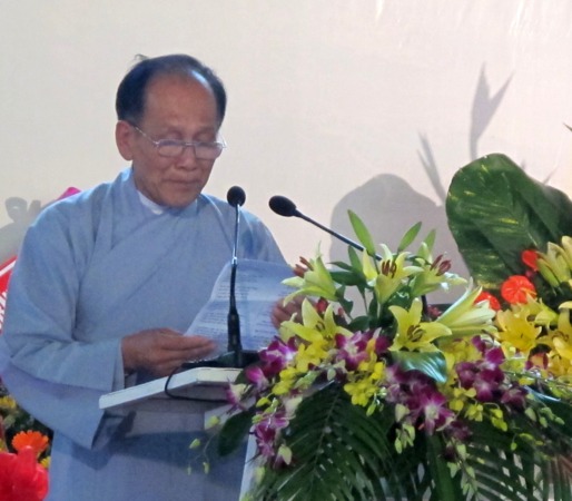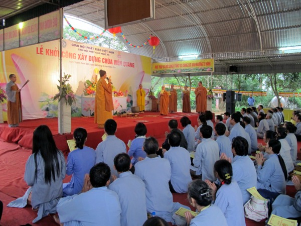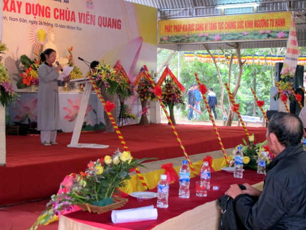 Ngày hôm nay lễ khởi công chính thức sau những yếu tố Pháp lý đã thành tựu do Đảng, nhà nước, chính quyền hết sức hỗ trợ, phần chúng ta mỗi người một giọt mồ hôi, một đồng tiền, một cánh tay, một tâm huyết để dựng lại ngôi chùa Viên Quang. Dựng lại theo tiêu chuẩn Bác Hồ nói gấp 10 lần trước đây, tức là “”Xây dựng lại đàng hoàng hơn, to đẹp hơn”, chỉ vì đây không những là một địa điểm tâm linh mà còn là một di tích văn hóa cần được tôn tạo. Vì vậy chúng ta sẽ kiến nghị ngành Xây dựng tỉnh, điều chỉnh bản thiết kế để công trình tương xứng với nguồn kinh phí khoảng 50 tỉ đồng.