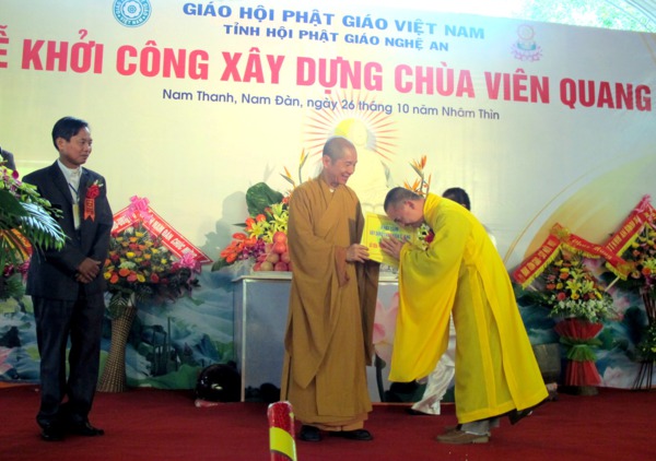 Đến nay, Chùa Viên Quang đã hội đủ các điều kiện pháp lý theo quy định để xây dựng mới lại chánh điện cùng với 14 hạng mục công trình theo phê duyệt quy hoạch của UBND tỉnh Nghệ An. Duyên lành đã đủ, Ban Tổ chức xin tuyên bố khai mạc Lễ Động Thổ kiến tạo chùa Viên Quang trong niềm hân hoan của những người con Phật, cũng như của chính quyền các cấp và nhân dân xứ Nghệ.