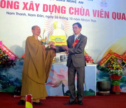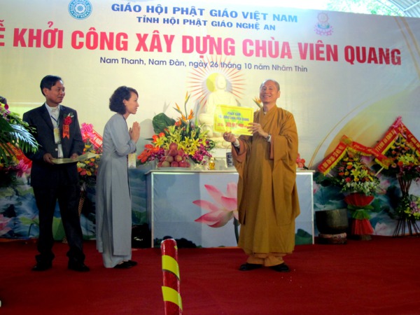 Tại buổi lễ, ông Kim Quốc Hoa thay mặt cho Hội Người Cao Tuổi Việt Nam bày tỏ tấm lòng chân thành cảm ơn TT.Thích Chân Quang và Phật tử các đạo tràng chùa Phật Quang, trong thời gian qua đã có nhiều đóng góp niềm vui cho người cao tuổi cả nước. Mặt khác, ông cũng nhận xét “Cùng với sự kiện khởi công xây chùa Viên Quang hôm nay lại là ngày sinh nhật của TT.Thích Chân Quang. Sự trùng hợp này hết sức thiết thực, chúng tôi cho rằng ngôi chùa Viên Quang của xã Nam Thanh, huyện Nam Đàn chắc chắn khi khởi công sẽ được đẩy nhanh tiến độ, sớm đưa vào sử dụng, để chùa đây trở thành điểm tâm linh và hàng năm có thể tổ chức Lễ hội như nhiều ngôi chùa lịch sử khác.