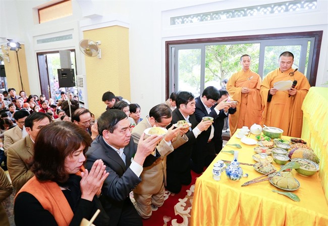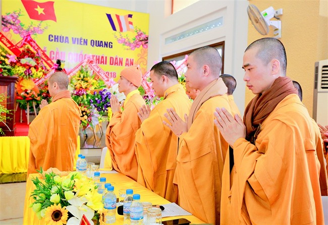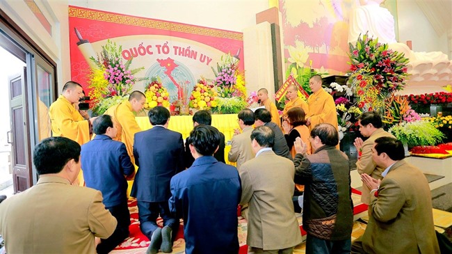 Kế đến, tiếng nhạc của bài Quốc ca, Đạo ca vang lên trầm hùng trong niềm xúc động của người con Phật. Tiếp theo, Chư tôn đức, cùng các vị Lãnh đạo chính quyền tỉnh Nghệ An, các vị Cán bộ huyện Nam Đàn, xã Nam Thanh và toàn thể đồng bào phật tử dành một phút mặc niệm để tri ân, bày tỏ lòng biết ơn sâu sắc đến các bậc tiền nhân đã có công lao to lớn trong công cuộc dựng nước và giữ nước suốt chiều dài lịch sử của dân tộc, cũng như các anh hùng liệt sĩ đã hy sinh vì Nước trong sự nghiệp giải phóng dân tộc và bảo vệ Tổ quốc.