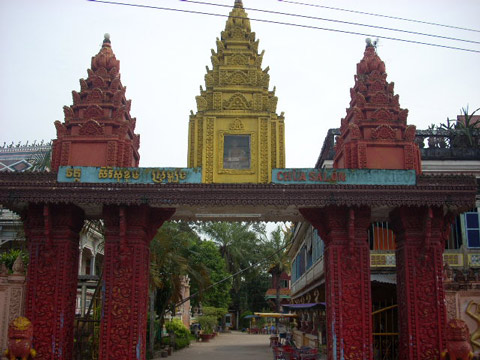Trên thành cổng có dòng chữ Khmer và chữ quốc ngữ: “Chùa Sà Lôn (Chén Kiểu)”. Cổng chùa nổi bật bởi sắc màu đỏ và vàng, bên trên đó là 3 ngôi tháp, tháp giữa cao hơn hai tháp hai bên, được chạm khắc, đắp nổi các hình tượng mang tính biểu trưng văn hóa truyền thống Khmer Nam bộ.