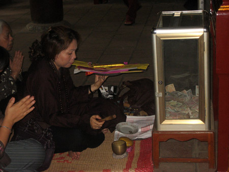 Rất đông khách thập phương, trong đó có một phần không nhỏ là sinh viên học sinh, đến đây để cầu xin tài, lộc, tình duyên, quan chức, v,v. Lễ vật họ mang đến là những thứ phổ biến, trong đó đặc biệt nhiều là tiền (âm và dương). Vào những ngày tuần thì hàng tạ tiền âm phủ và đồ mã được đốt, khét lẹt cả một vùng trời. Muốn ngăn cũng khó mà được.
