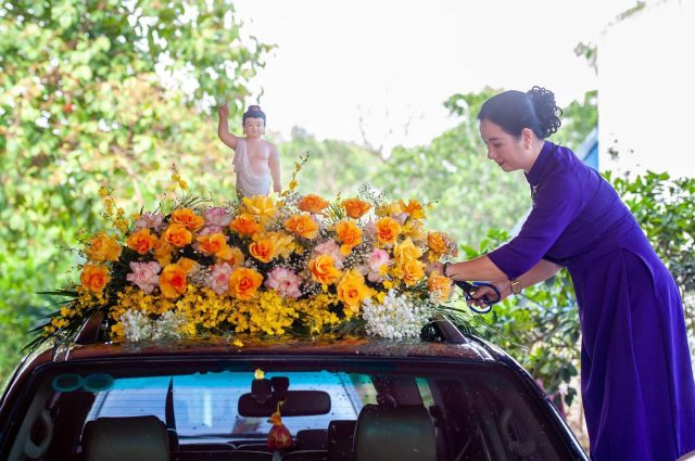 Xe hoa gồm một tượng Đức Phật đản sinh và nhiều loại hoa hồng kèm phụ kiện để thể hiện sự trang nghiêm, tôn kính. Theo kinh Phật dạy, hoa hồng tượng trưng cho người con hiếu hạnh. Để hoàn thành xe hoa này, 4 người phải làm trong hơn 3 giờ.